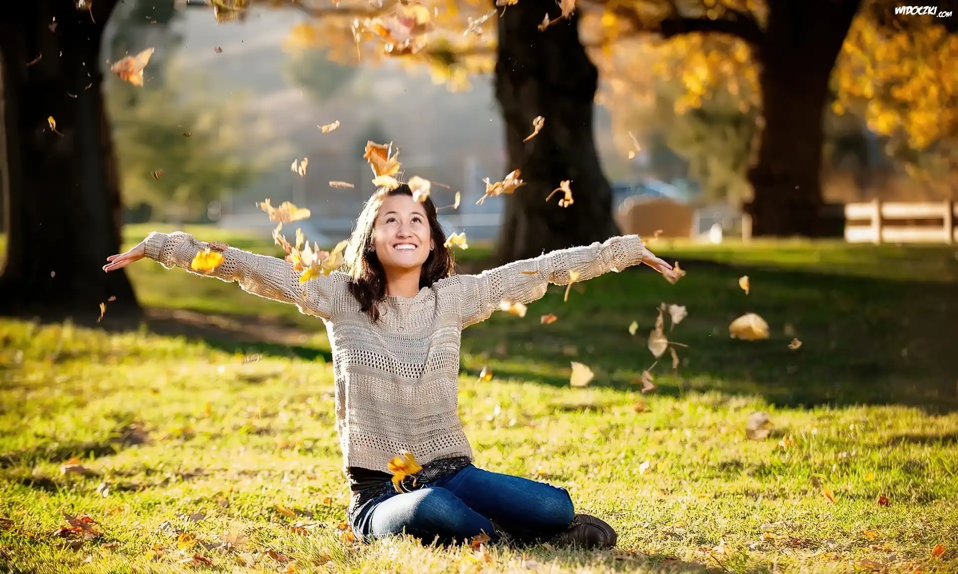 Zdjęcia, Radosna, Dziewczyna, Jesień, Drzewa, Spadające, Liście, Trawa