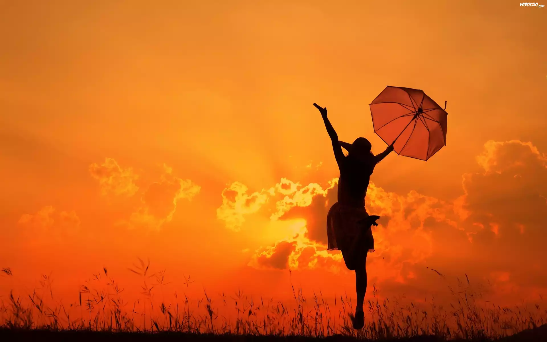 Zdjęcia, Dziewczyna, Parasolka, Radość, Zachód, Słońca, Chmury