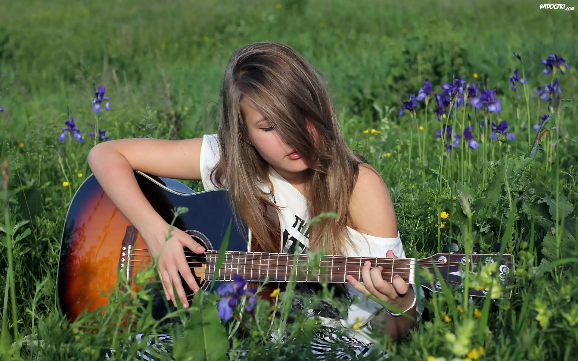 Zdjęcia, Łąka, Trawa, Kwiaty, Dziewczyna, Gitara