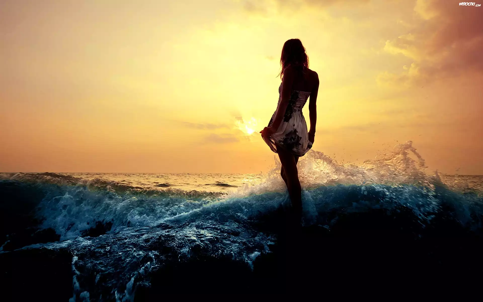 Dziewczyna, Morze, Fale, Zachód Słońca