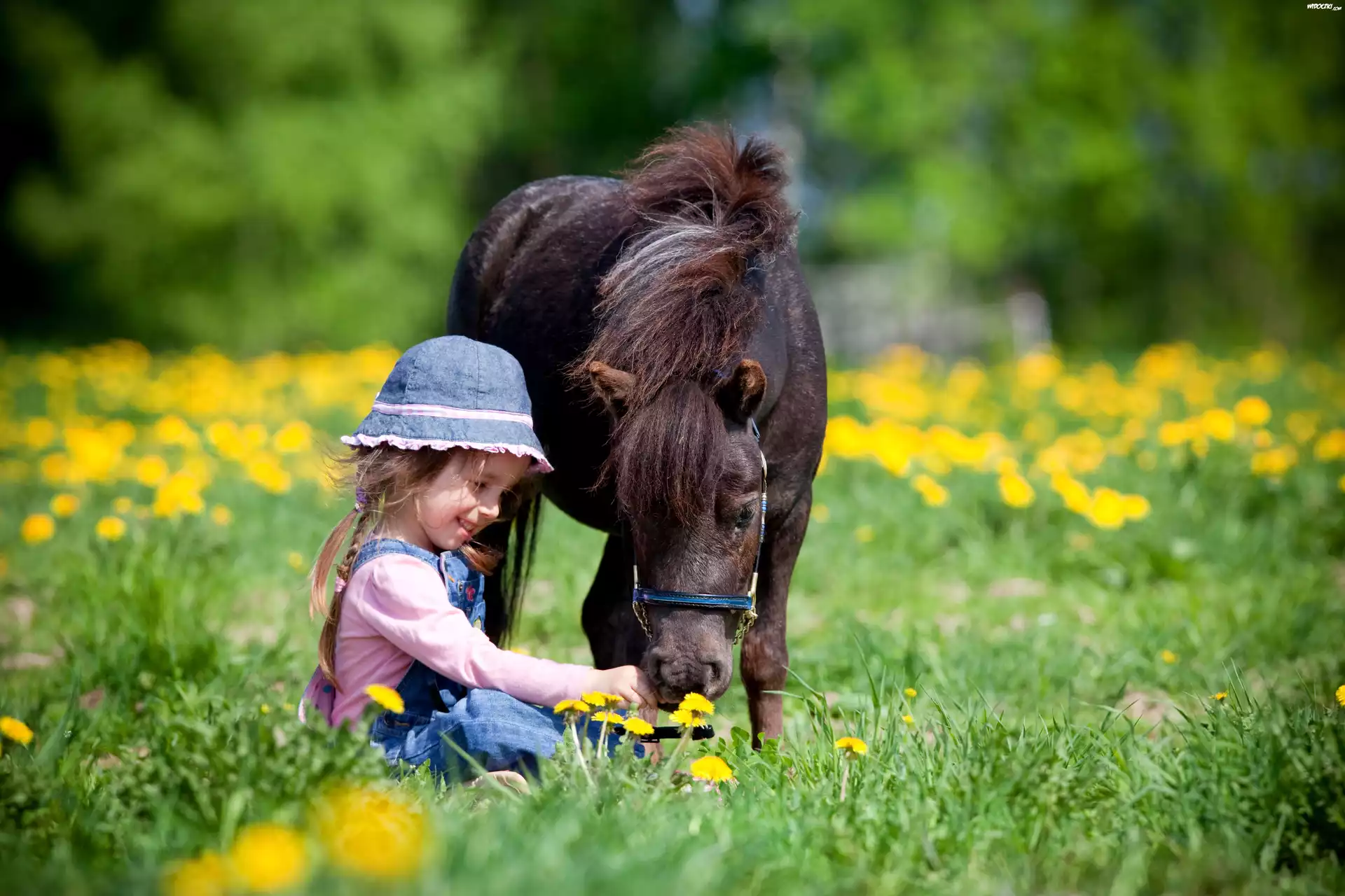 Zdjęcia, Dziewczynka, Koń, Łąka, Kwiaty, Wiosna