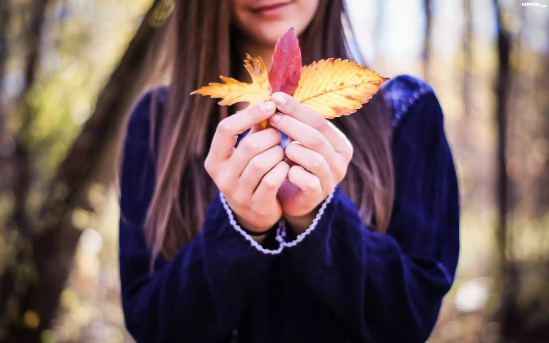 Zdjęcia, Dziewczynka, Ręce, Liście, Jesień