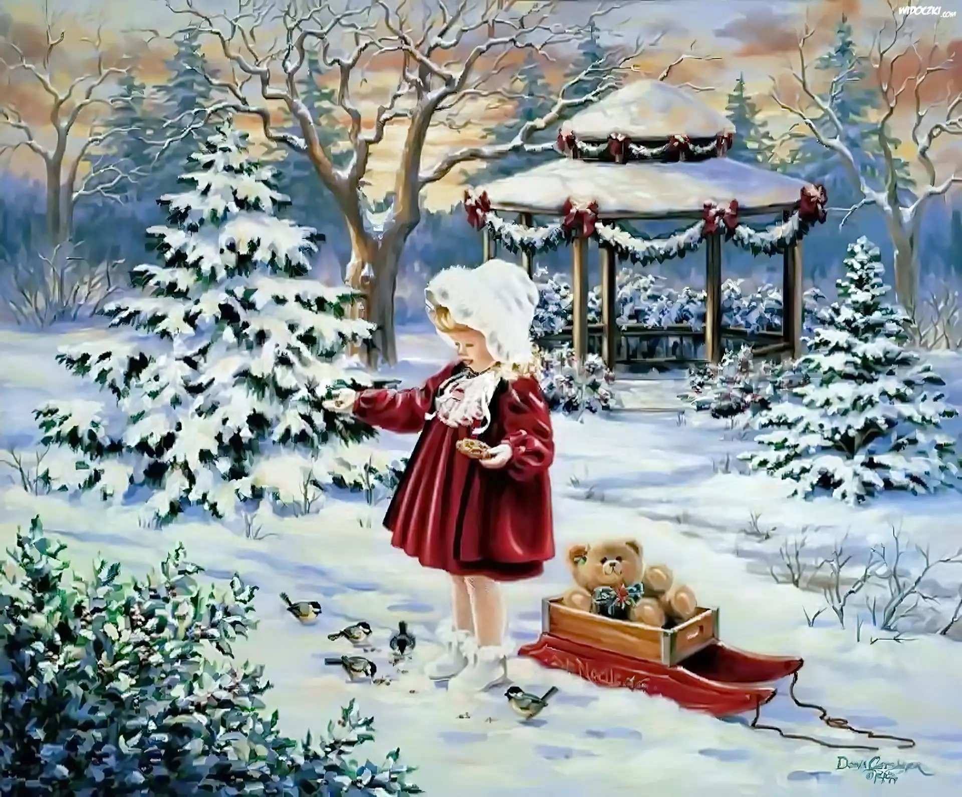 Dziewczynka, Karmi, Ptaszki, Sanki, Misiu, Zima