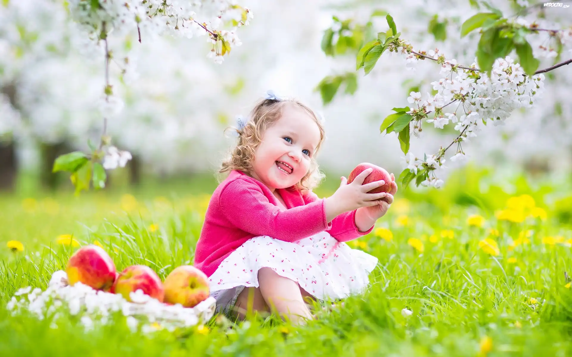 Radosna, Dziewczynka, Jabłka, Łąka, Kwitnące, Drzewa, Wiosna