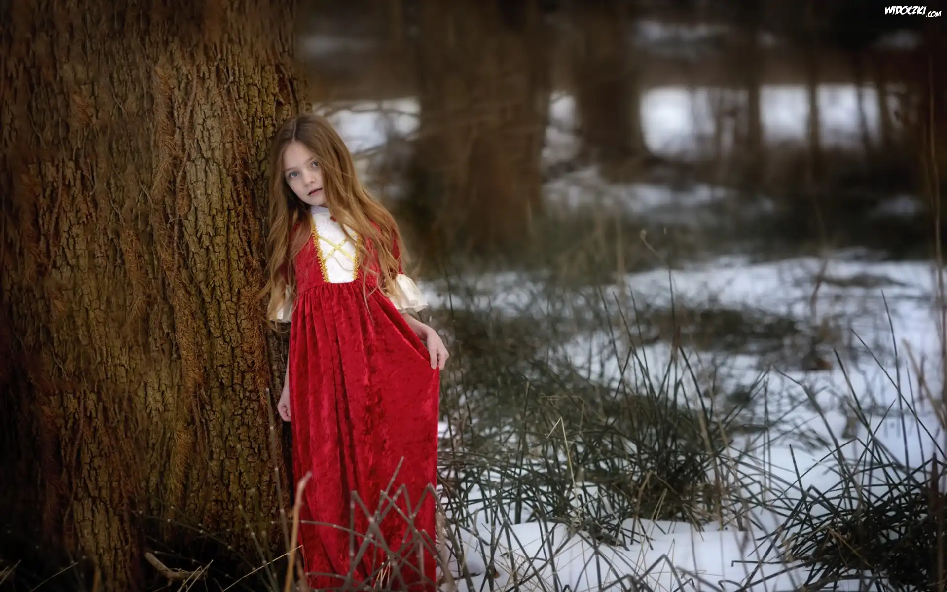 Zdjęcia, Dziewczynka, Las, Trawa, Śnieg