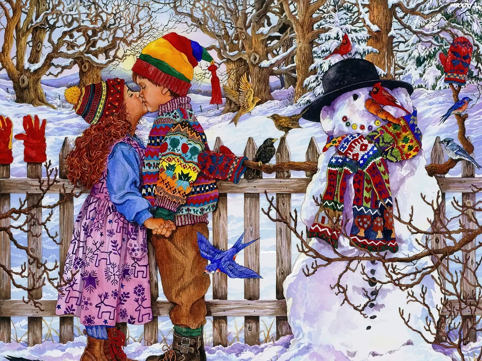 Dziewczynka, Chłopiec, Bałwan, Zima, Malarstwo