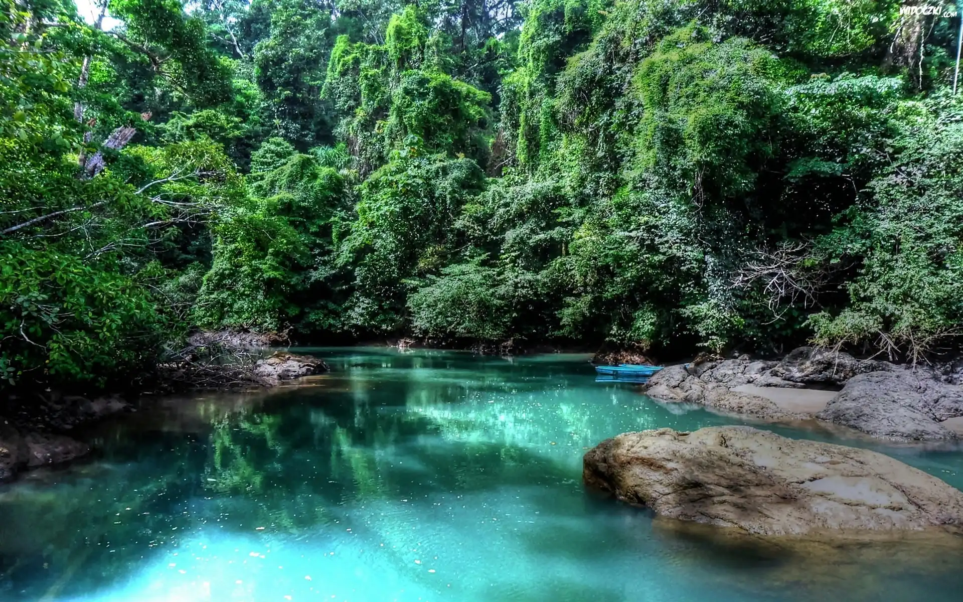 Zdjęcia, Dżungla, Rzeka, Skały, Przebijające, Światło