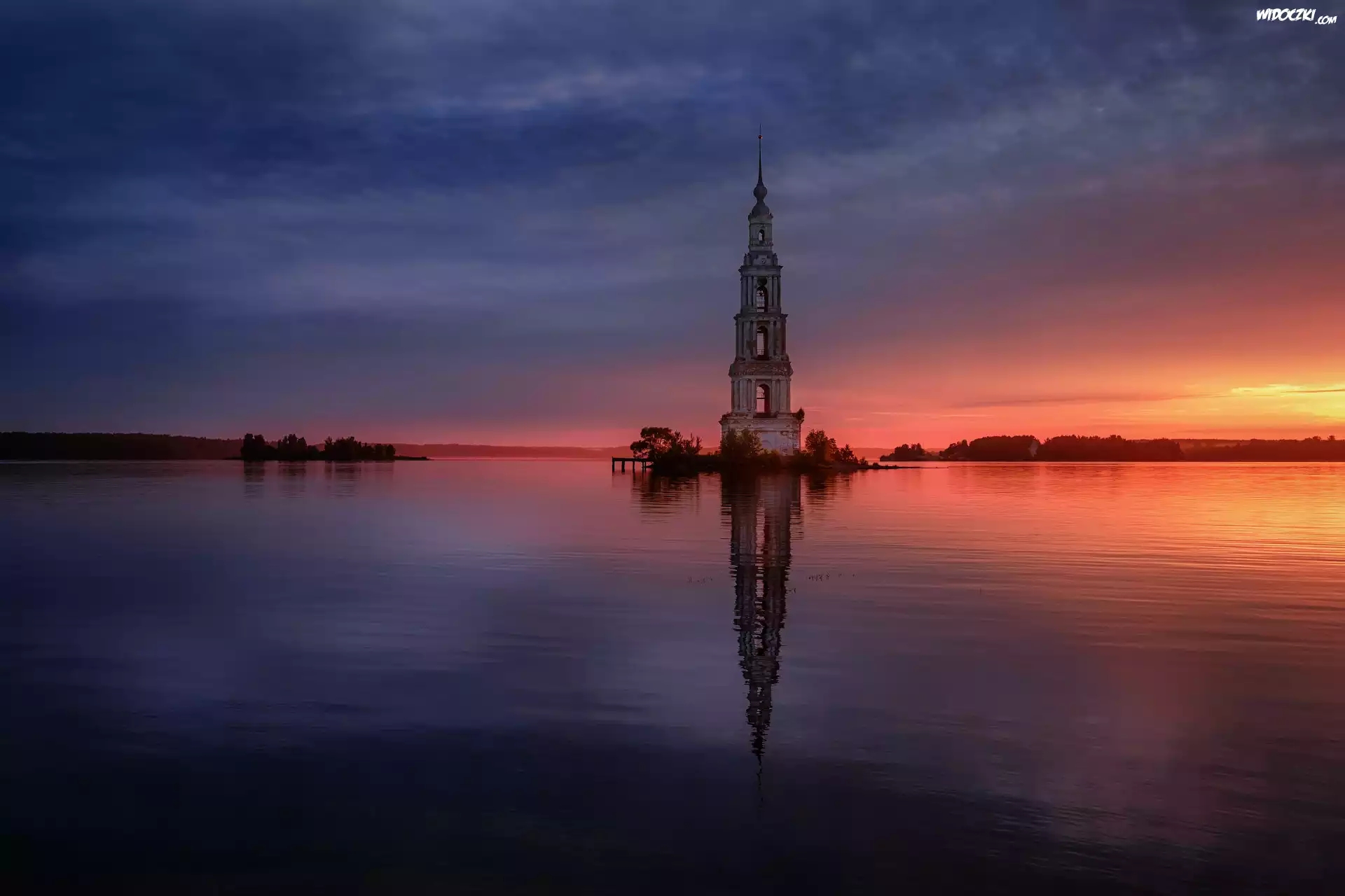Dzwonnica, Sobór św. Mikołaja, Kościół, Zbiornik Uglicki, Rzeka Wołga, Wschód słońca, Odbicie, Kalazin, Obwód twerski, Rosja |