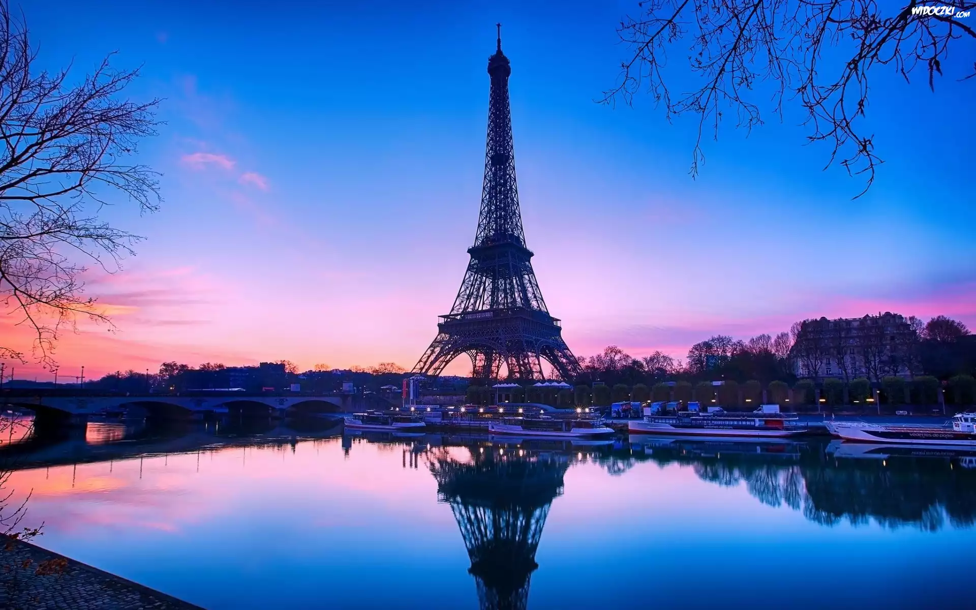 Zdjęcia, Wieża, Eiffla, Rzeka, Most, Statki, Wschód, Słońca, Paryż