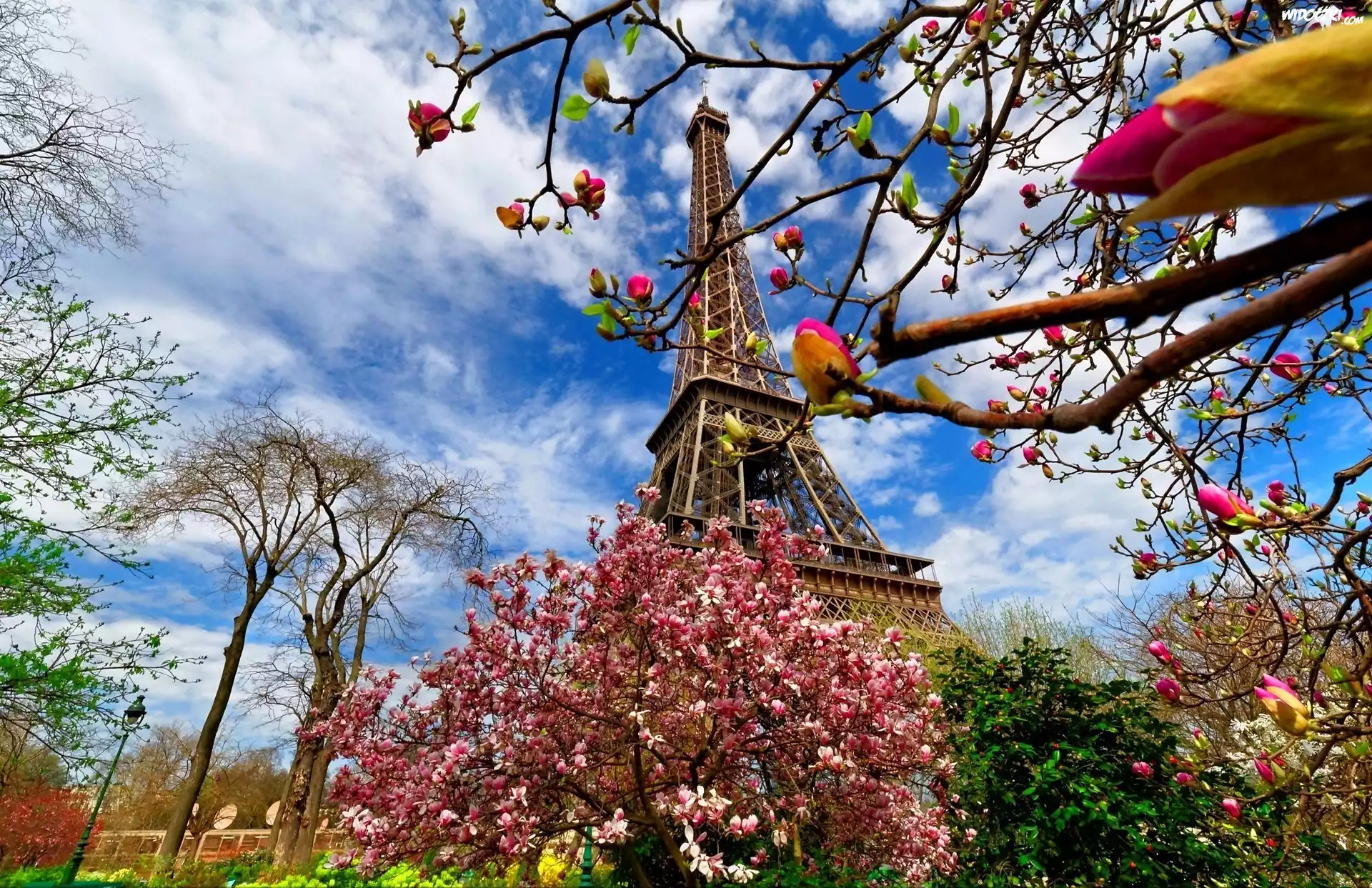 Zdjęcia, Wieża Eiffla, Kwitnące, Drzewa, Wiosna, Paryż, Francja