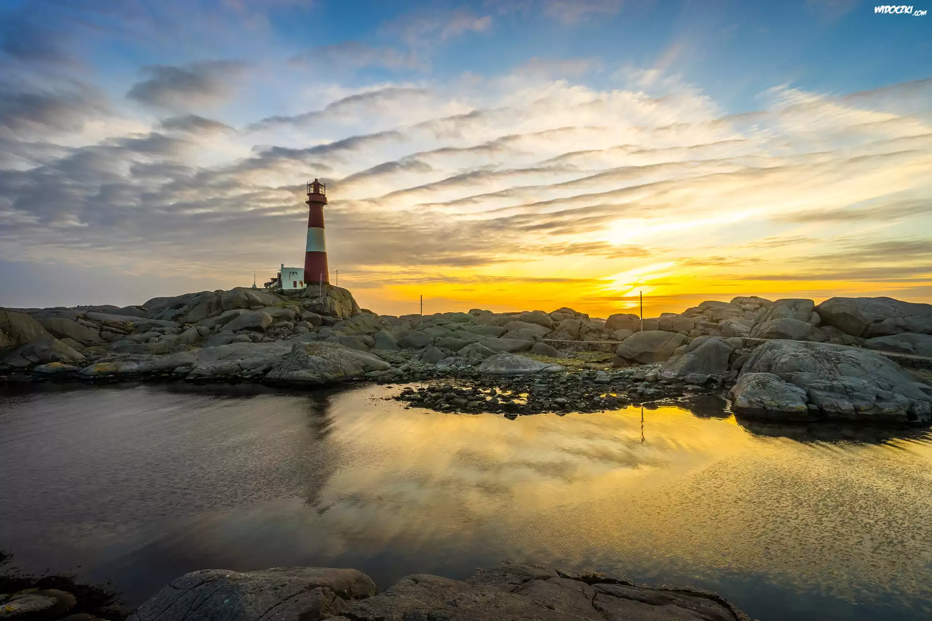 Zdjęcia, Latarnia morska Eigeroy, Wybrzeże, Skały, Wschód słońca, Chmury, Gmina Egersund, Norwegia