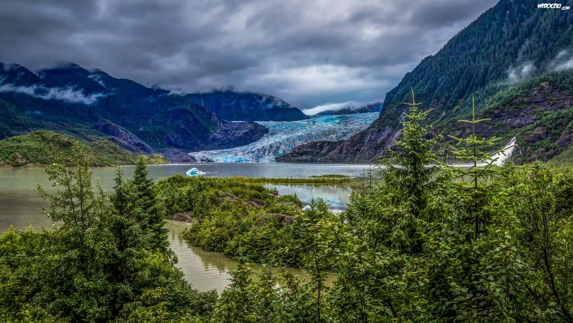 Zdjęcia, Góry, Jezioro Eklutna Lake, Lodowiec, Drzewa, Chmury, Stan Alaska, Stany Zjednoczone