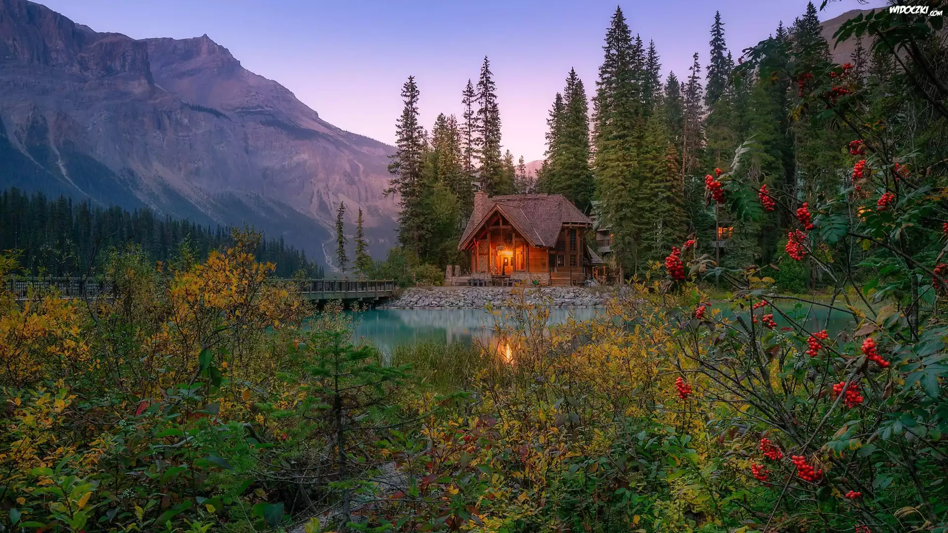Zdjęcia, Kanada, Park Narodowy Yoho, Góry, Jezioro, Emerald Lake, Drzewa, Jesień, Dom