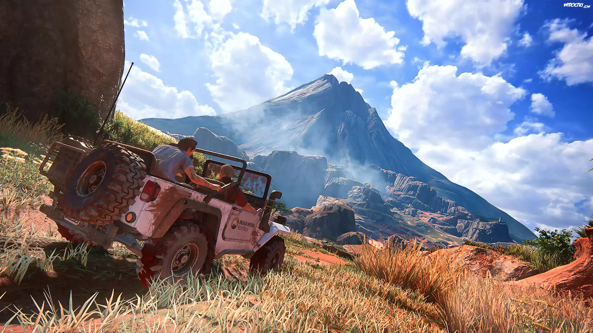 Gry, PC, XBOX, PS4, Uncharted 4 A Thiefs End, Samochód, Terenowy, Różowy, Góry, Wulkan