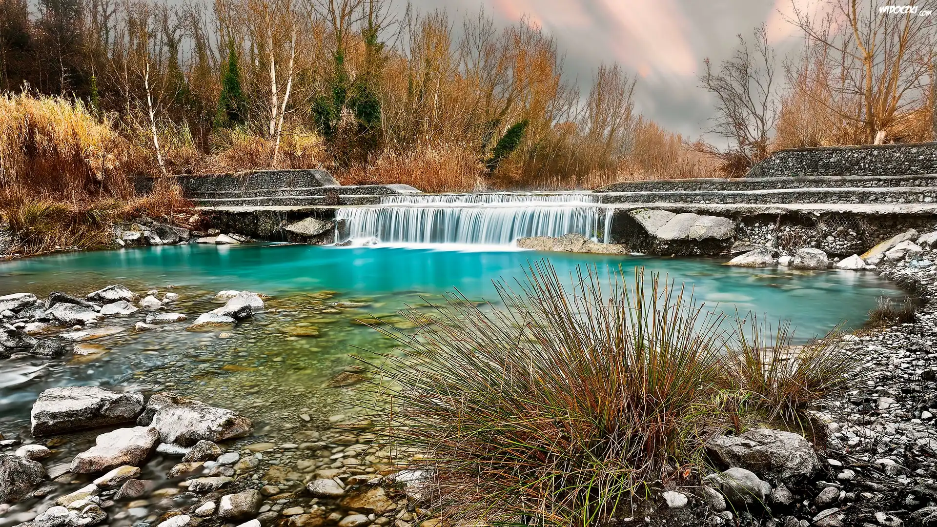 Zdjęcia, Rzeka Era, Kaskada, Drzewa, Kamienie, Peccioli, Toskania, Włochy