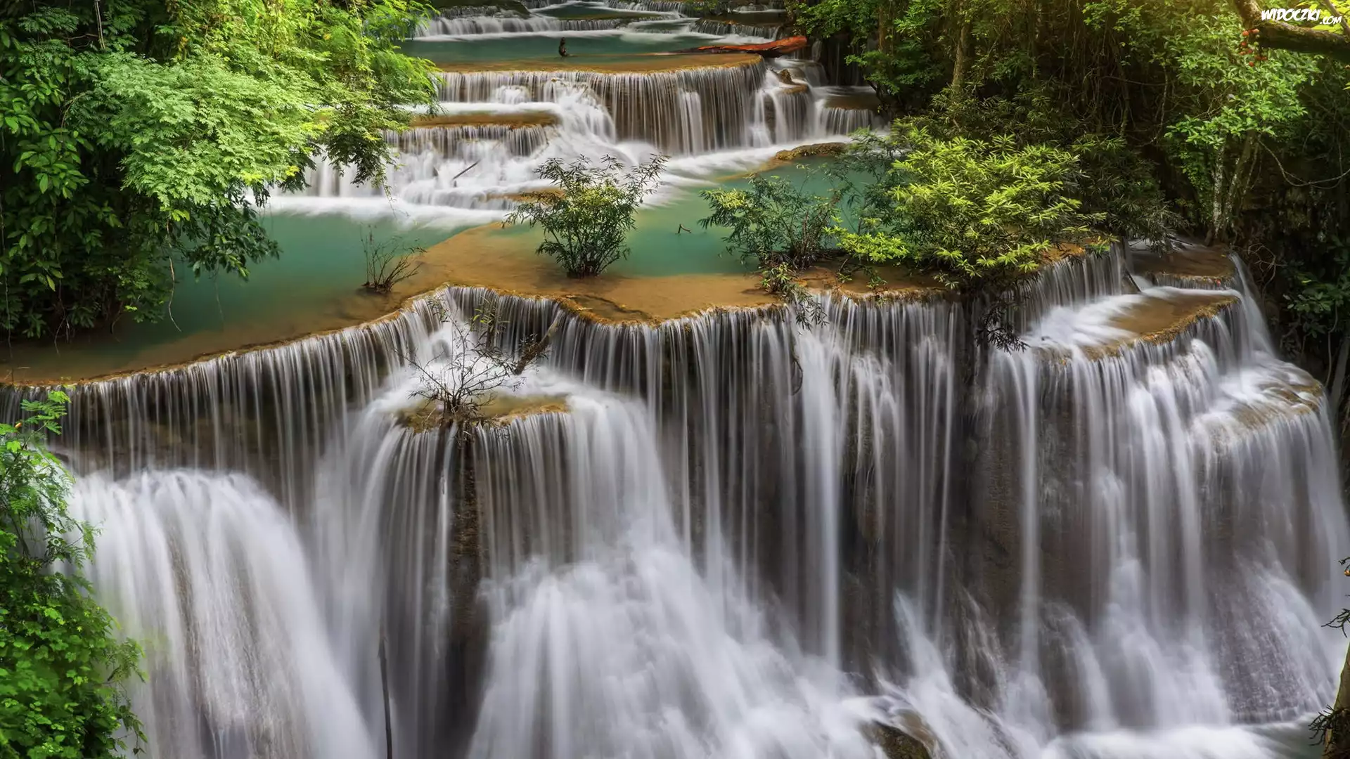 Zdjęcia, Wodospad, Erawan Falls, Kaskada, Park Narodowy Erawan, Drzewa, Prowincja Kanchanaburi, Tajlandia