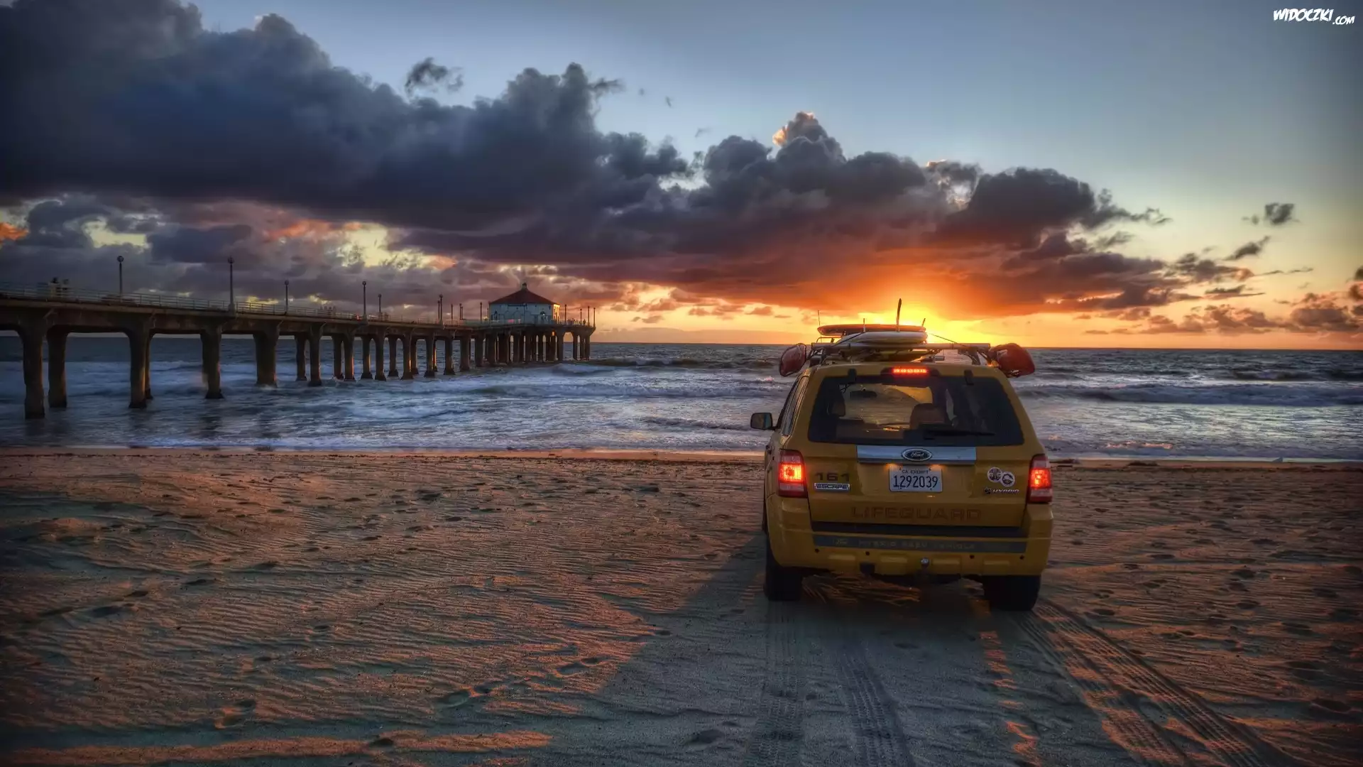 Ford Escape Hybrid, Plaża, Molo, Zachód słońca, Chmury