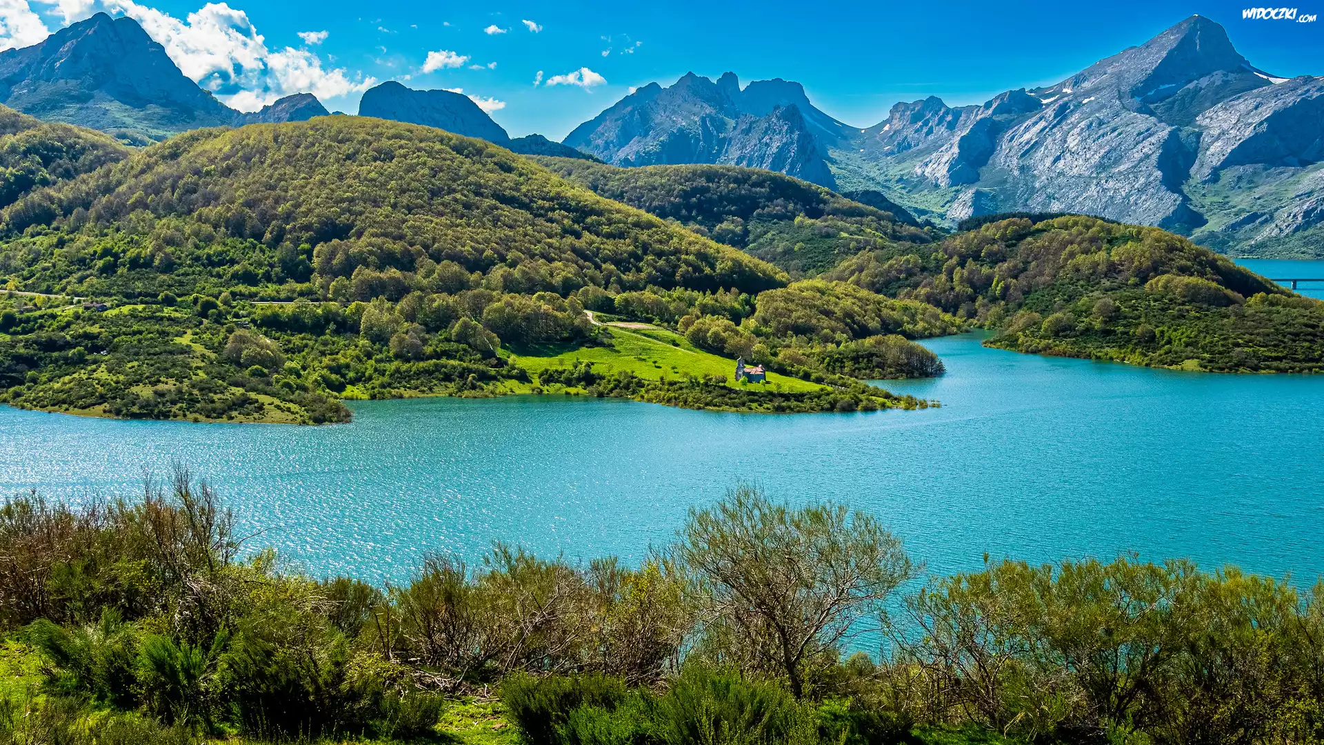 Zdjęcia, Hiszpania, Jezioro Embalse, Drzewa, Góry, Picos de Europa