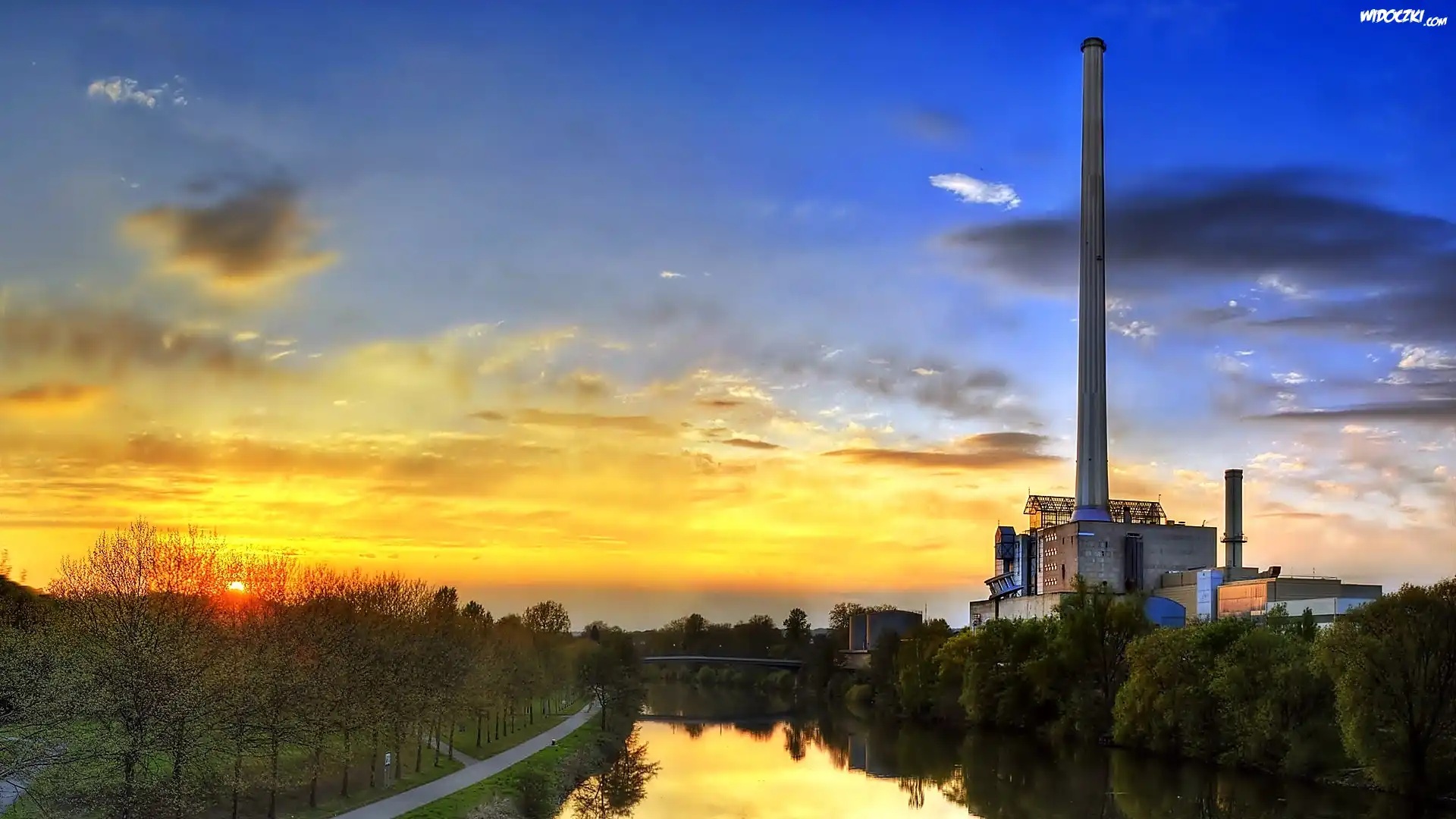 Zdjęcia, Fabryka, Komin, Rzeka, Drzewa, Świt