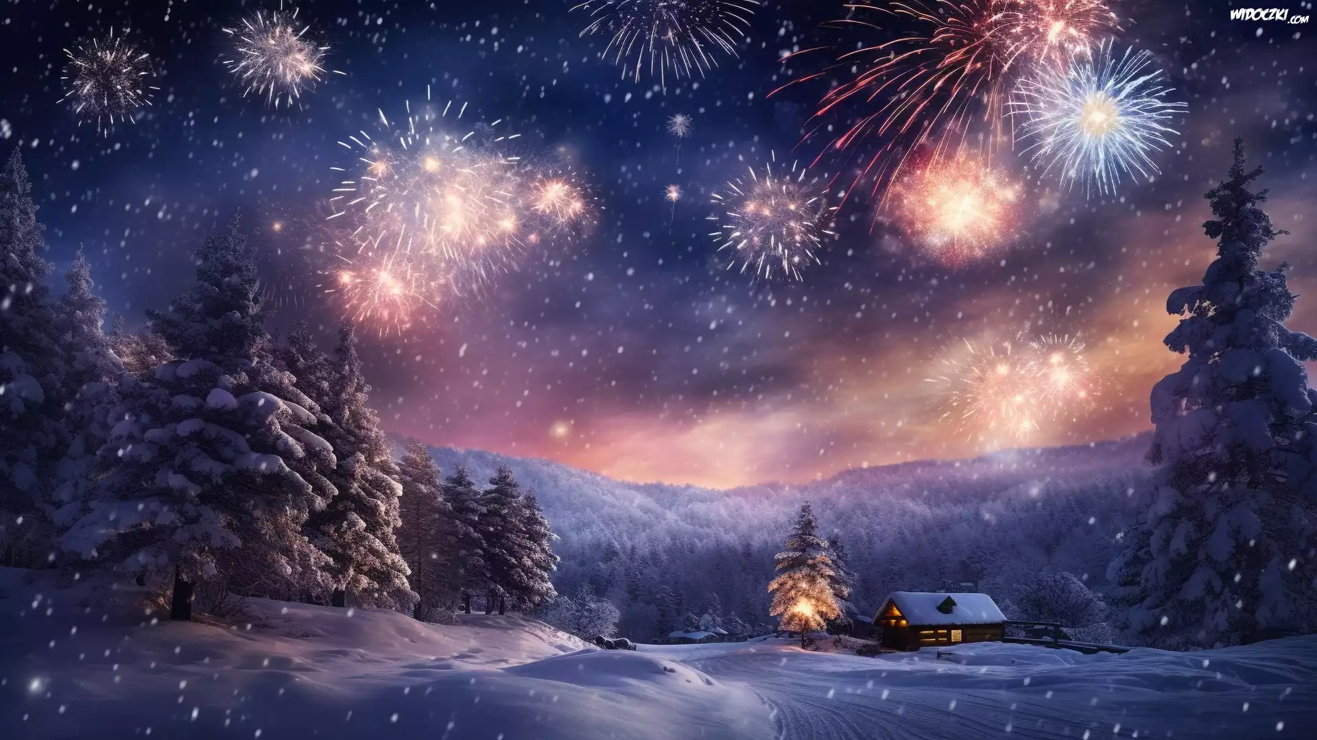 Zima, Góry, Dom, Fajerwerki, Śnieg, Drzewa, Noc