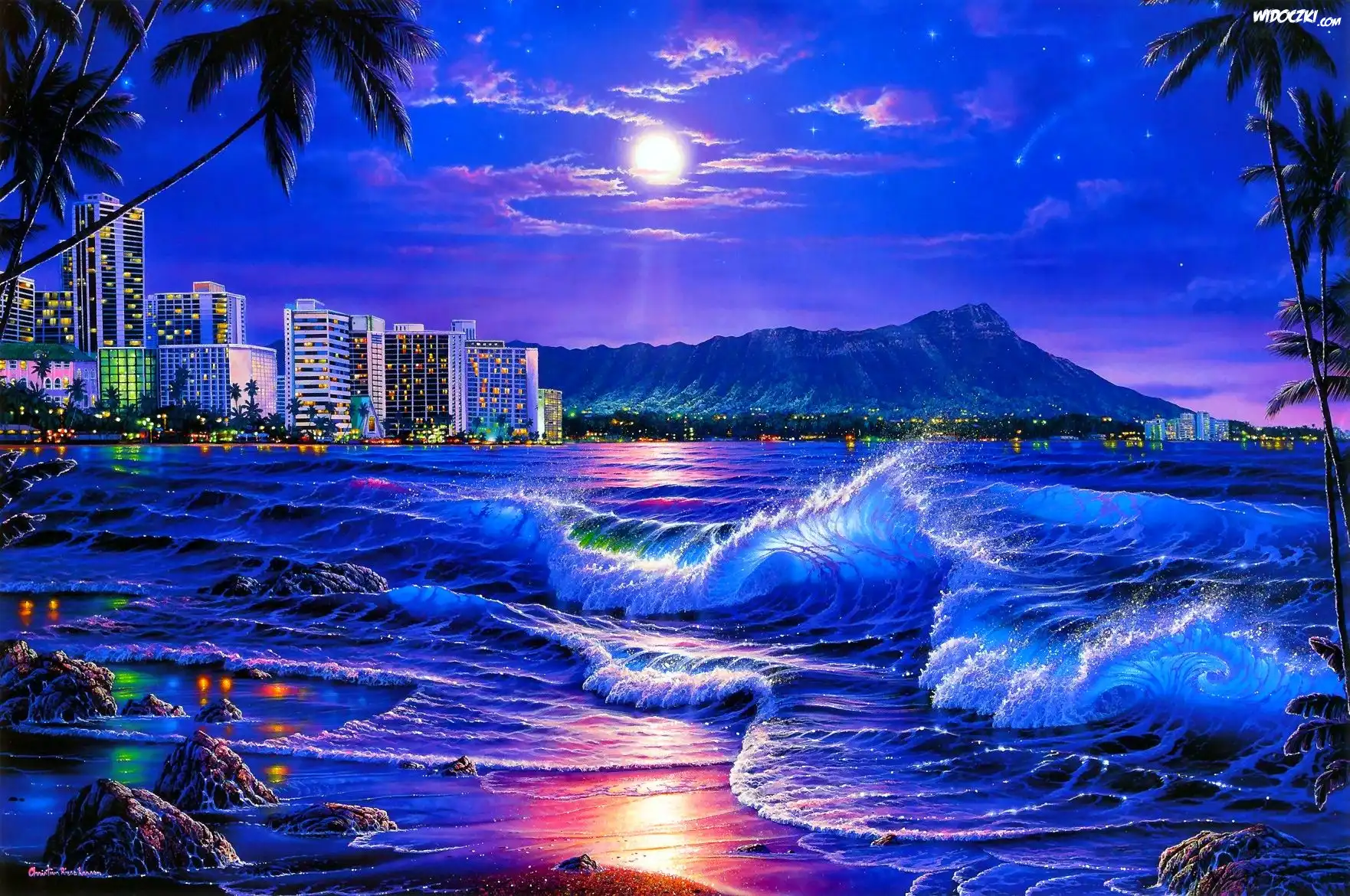 Zdjęcia, Fale, Wybrzeże, Miasto, Noc