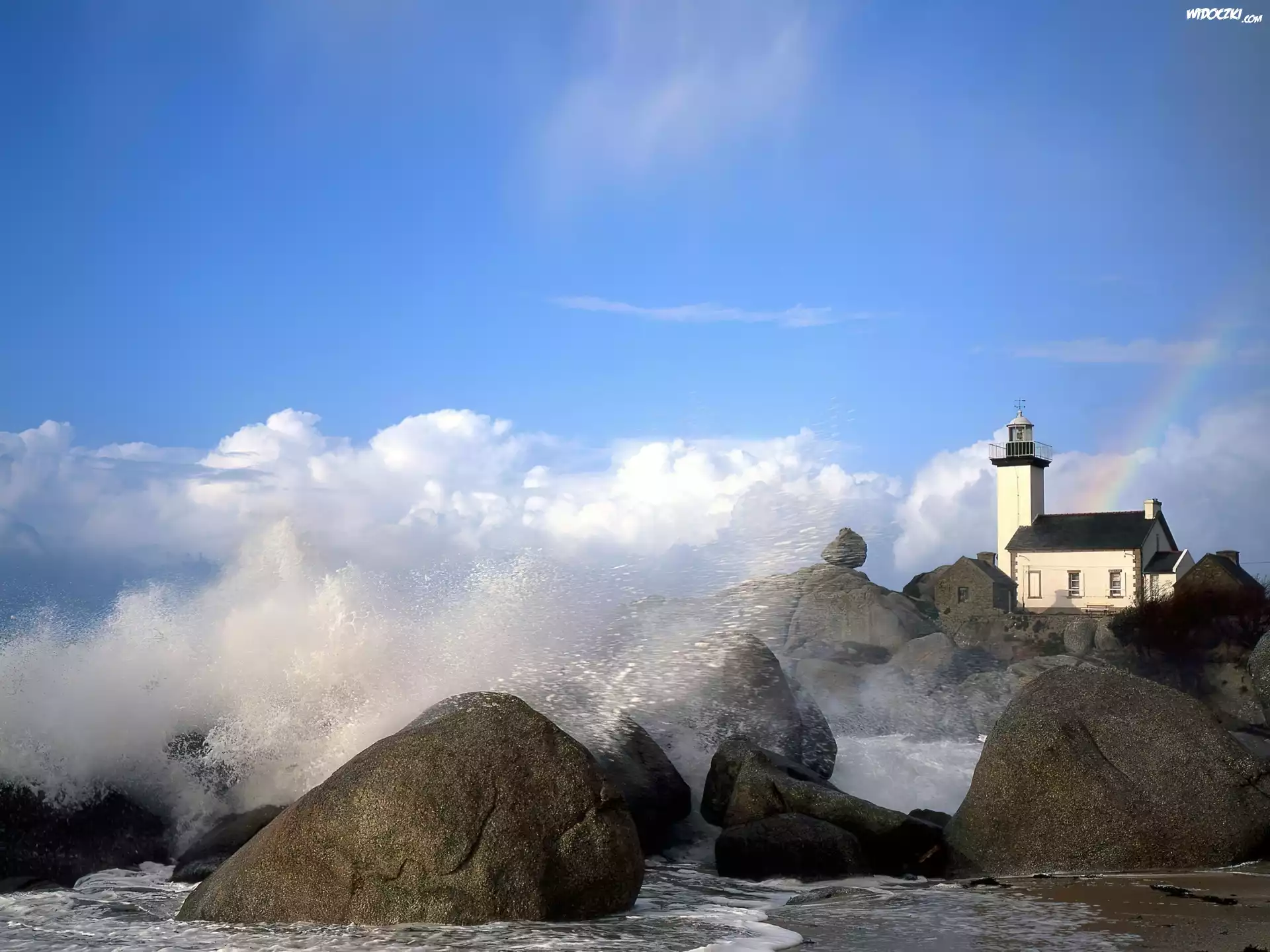 Zdjęcia, Fale, Kamienie, Latarnia morska, Tęcza