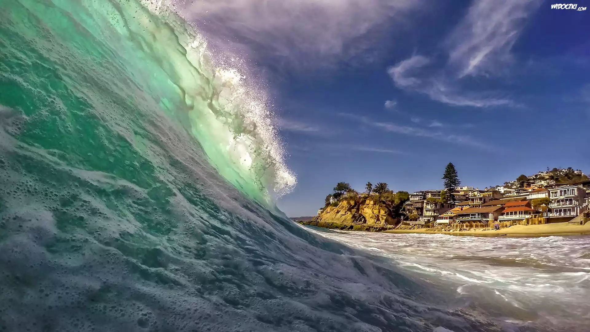 Zdjęcia, Morze, Fale, Wybrzeże, Domy, Laguna Beach, Kaifornia