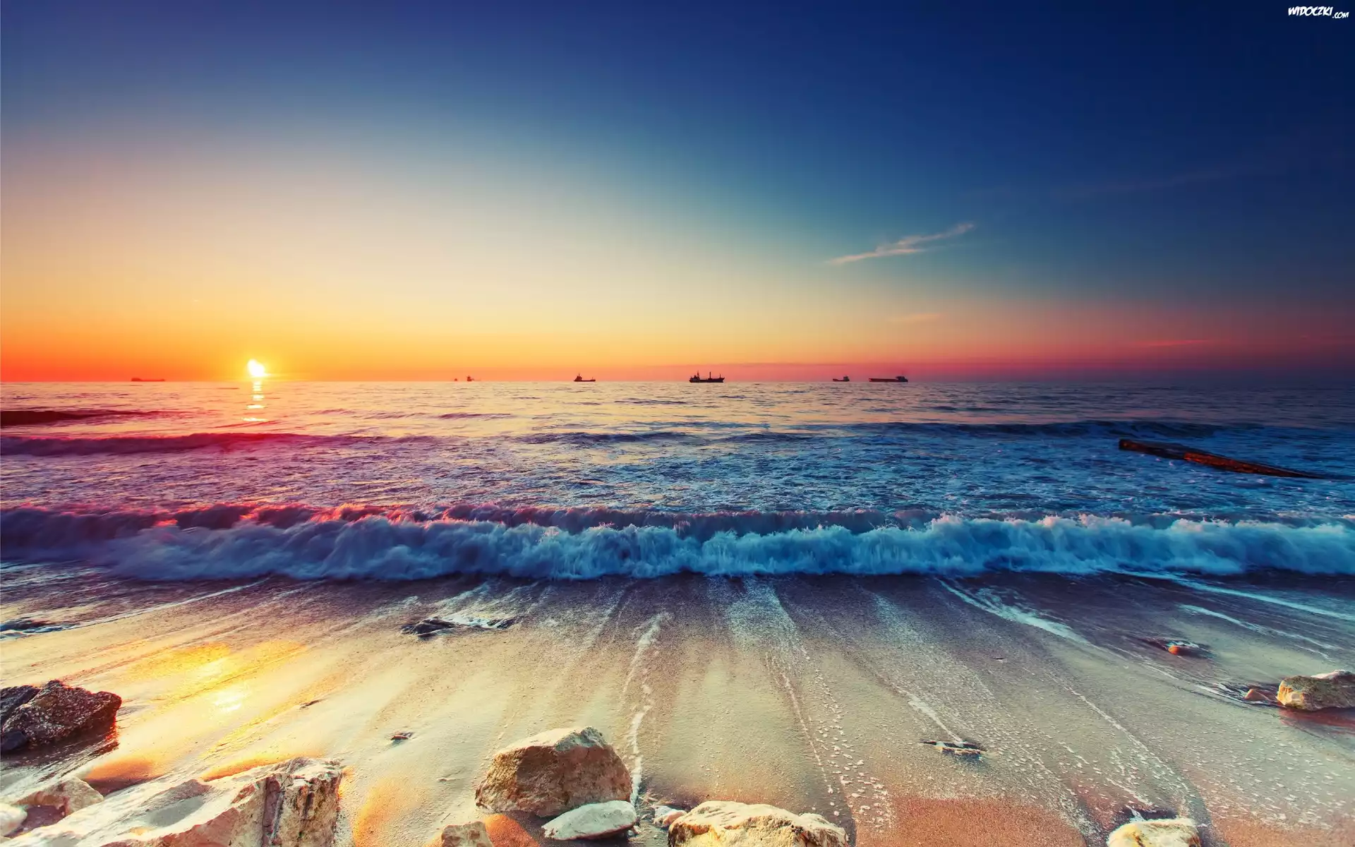 Zdjęcia, Morze, Fale, Statki, Plaża, Kamienie, Zachód, Słońca