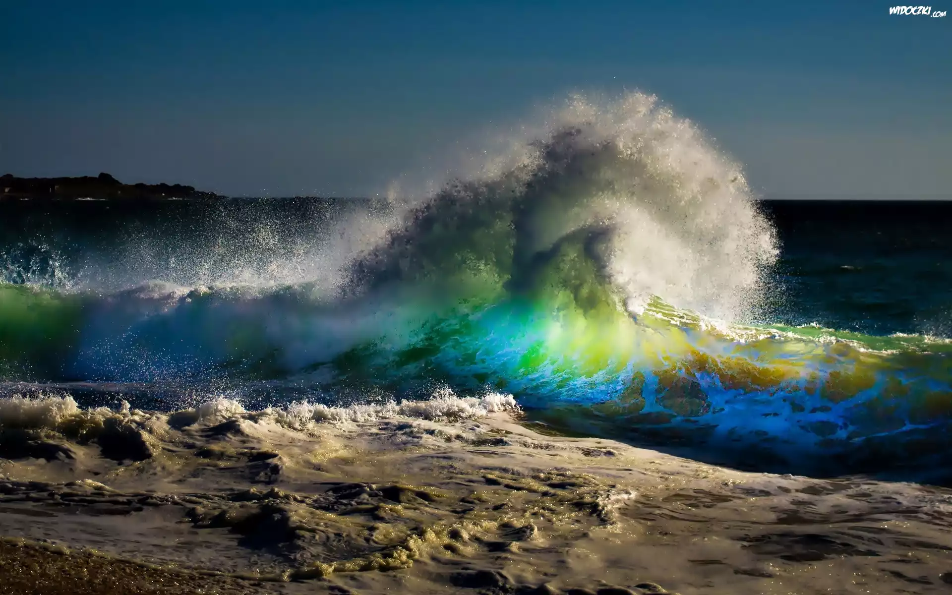 Windsurfing,deska na fali Zachód Słońca, Fale Morze, Fale, Kamienie Para, Księżyc Ogromna Spiętrzona Fala Fale, Morze Morze, Fala, Człowiek Windsurfing,żagiel Fala Windsurfing,żółta deska Skały, Fala, Rozbryzg Fale, Przebijające Światło Muszla, Plaża, Fala Konie, Galop, Woda