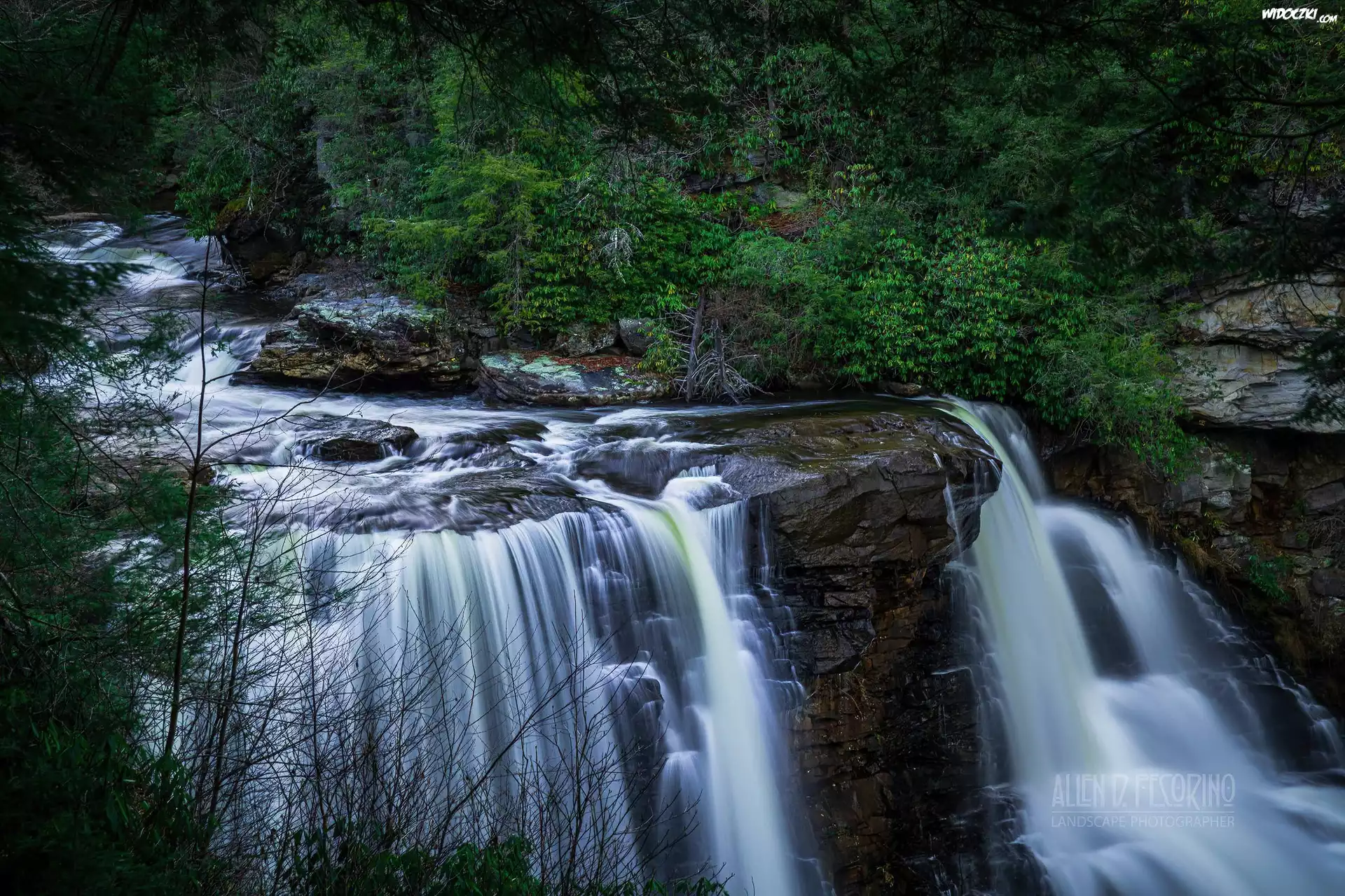 Stany Zjednoczone, Wirginia Zachodnia, Park Stanowy Blackwater Falls, Wodospad, Blackwater Falls, Kaskada, Skały, Drzewa, Roślinność |