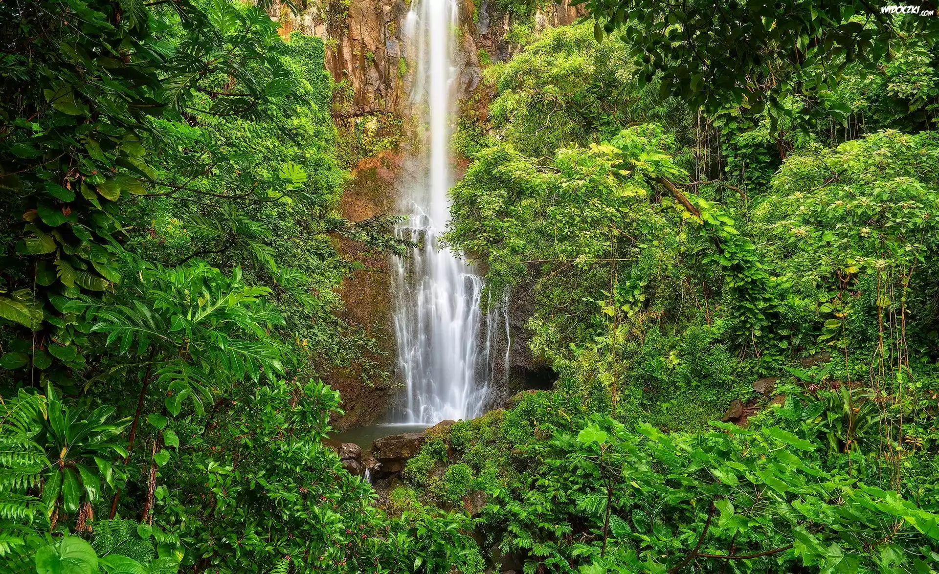 Zdjęcia, Wodospad Waimoku Falls, Park Narodowy Haleakala, Wyspa Maui, Hawaje, Drzewa, Roślinność
