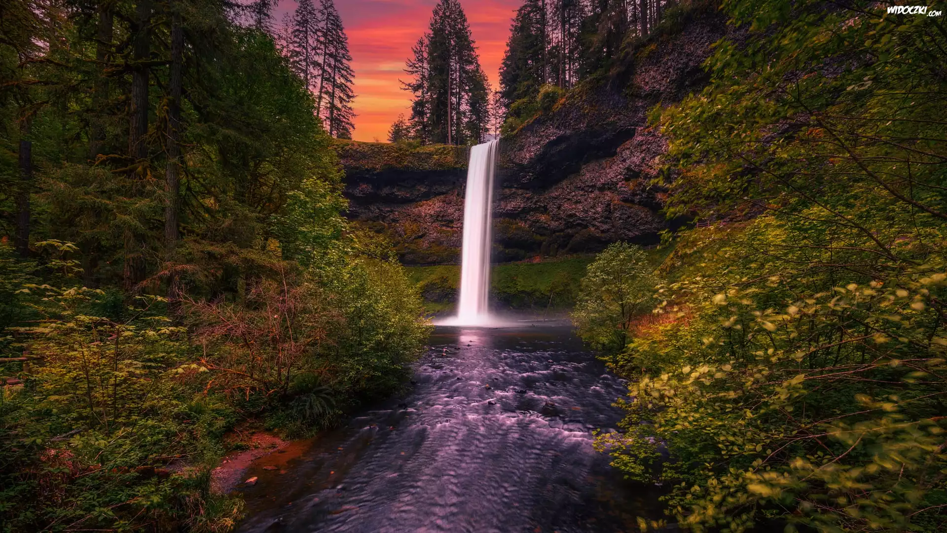 Zdjęcia, Stany Zjednoczone, Oregon, Park stanowy, Silver Falls State Park, Wodospad, South Falls, Drzewa, Zachód słońca, Skały