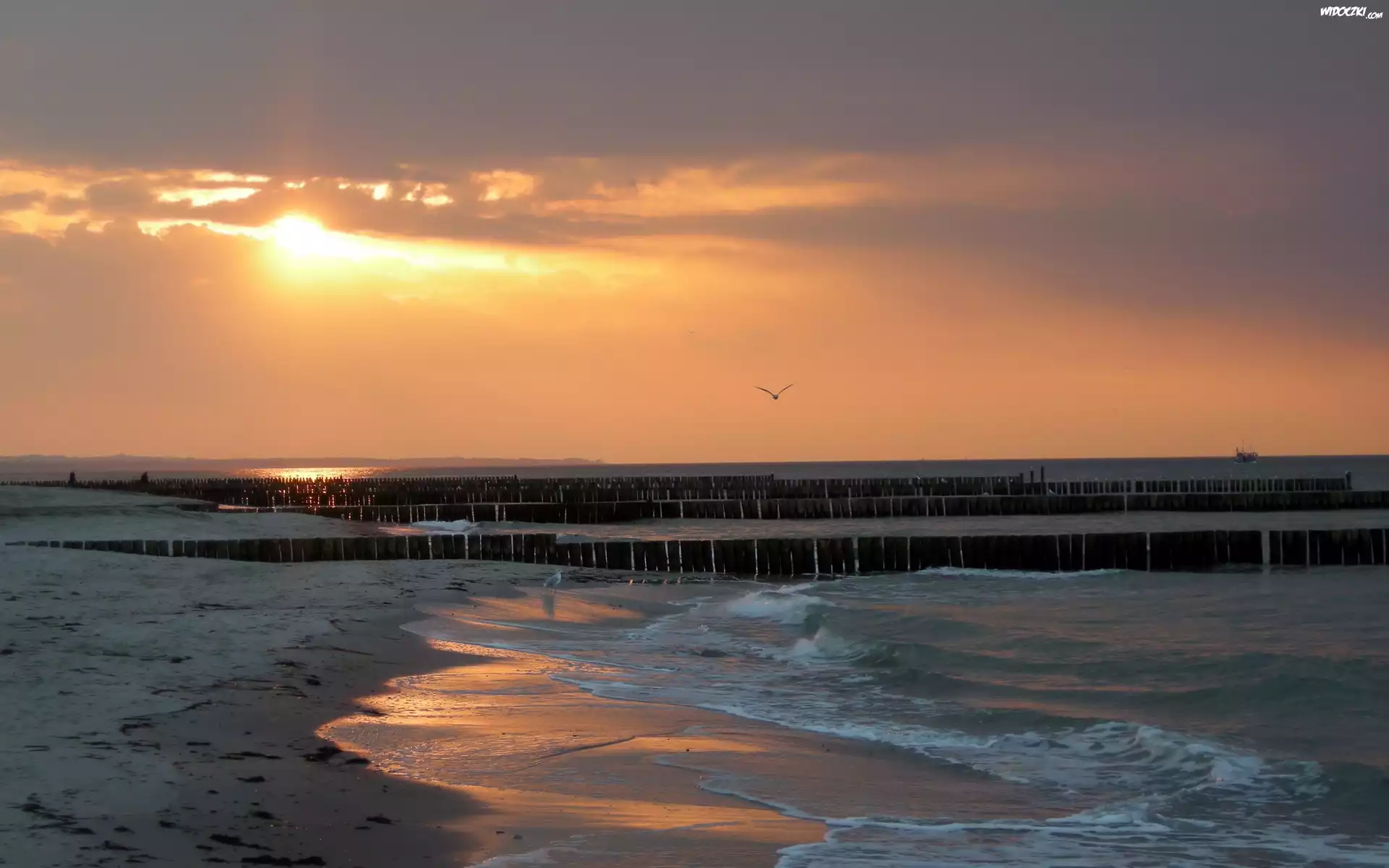 Zdjęcia, Plaża, Falochrony, Morze, Fale, Statek, Wschód, Słońca