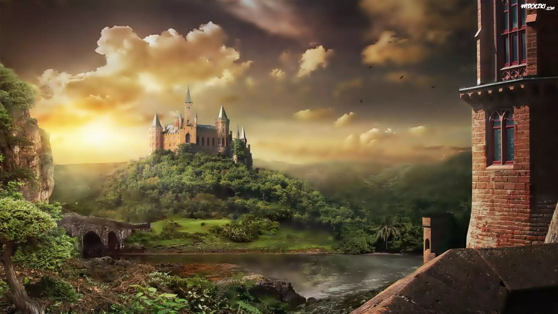 Fantasy, Zamek, Wzgórze, Rzeka, Most, Skały