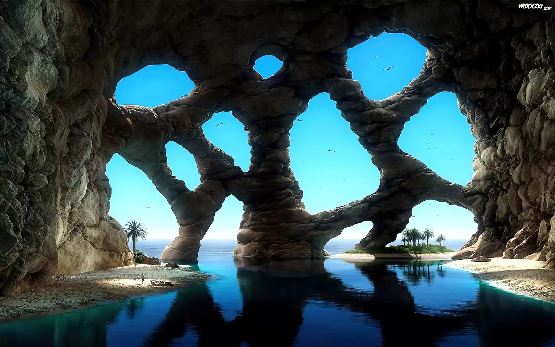Zdjęcia, Fantasy, Jaskinia, Skały, Morze, Palmy, Ptaki