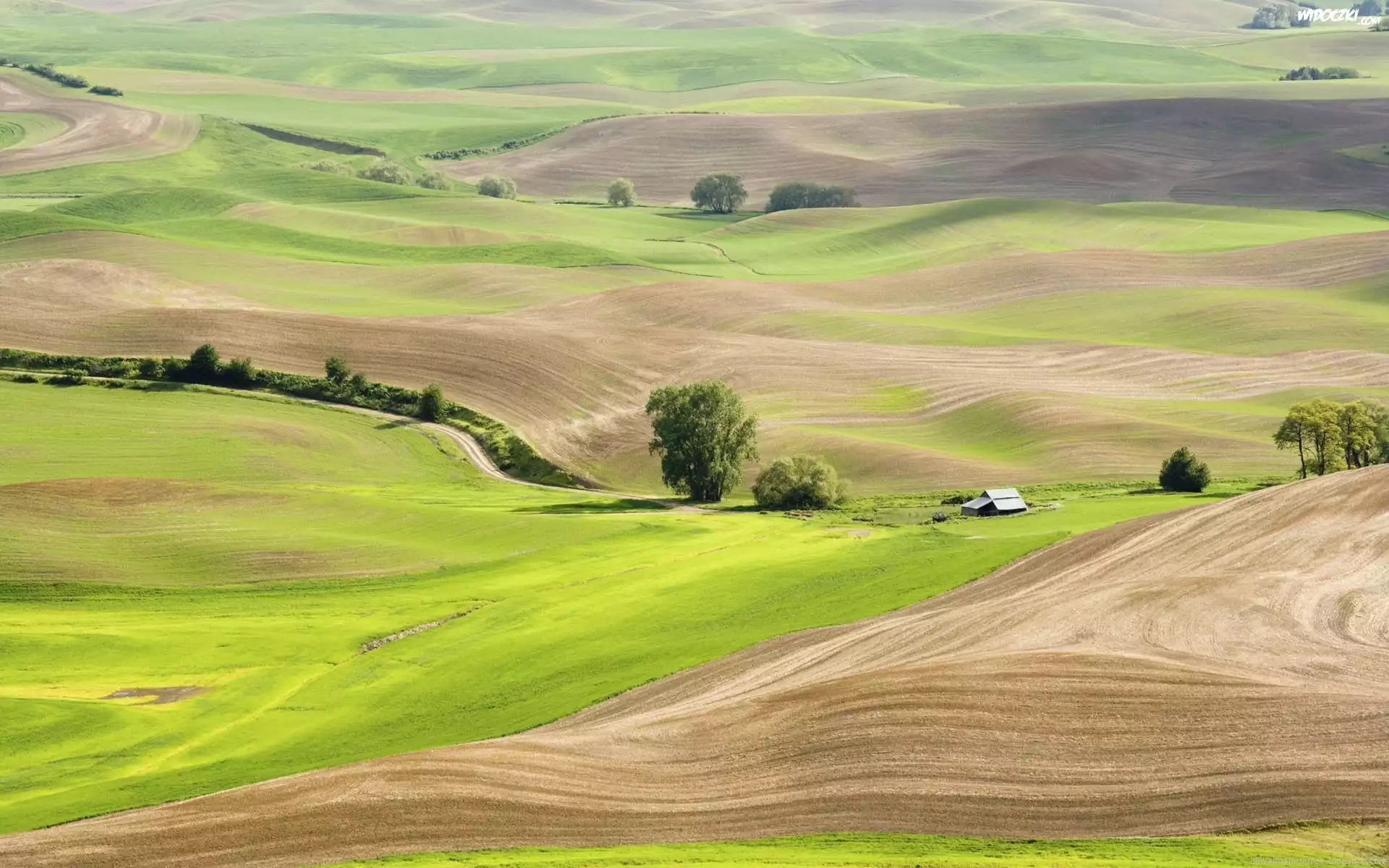 Zdjęcia, Farmy, Pola, Droga, Pagórki, Drzewa