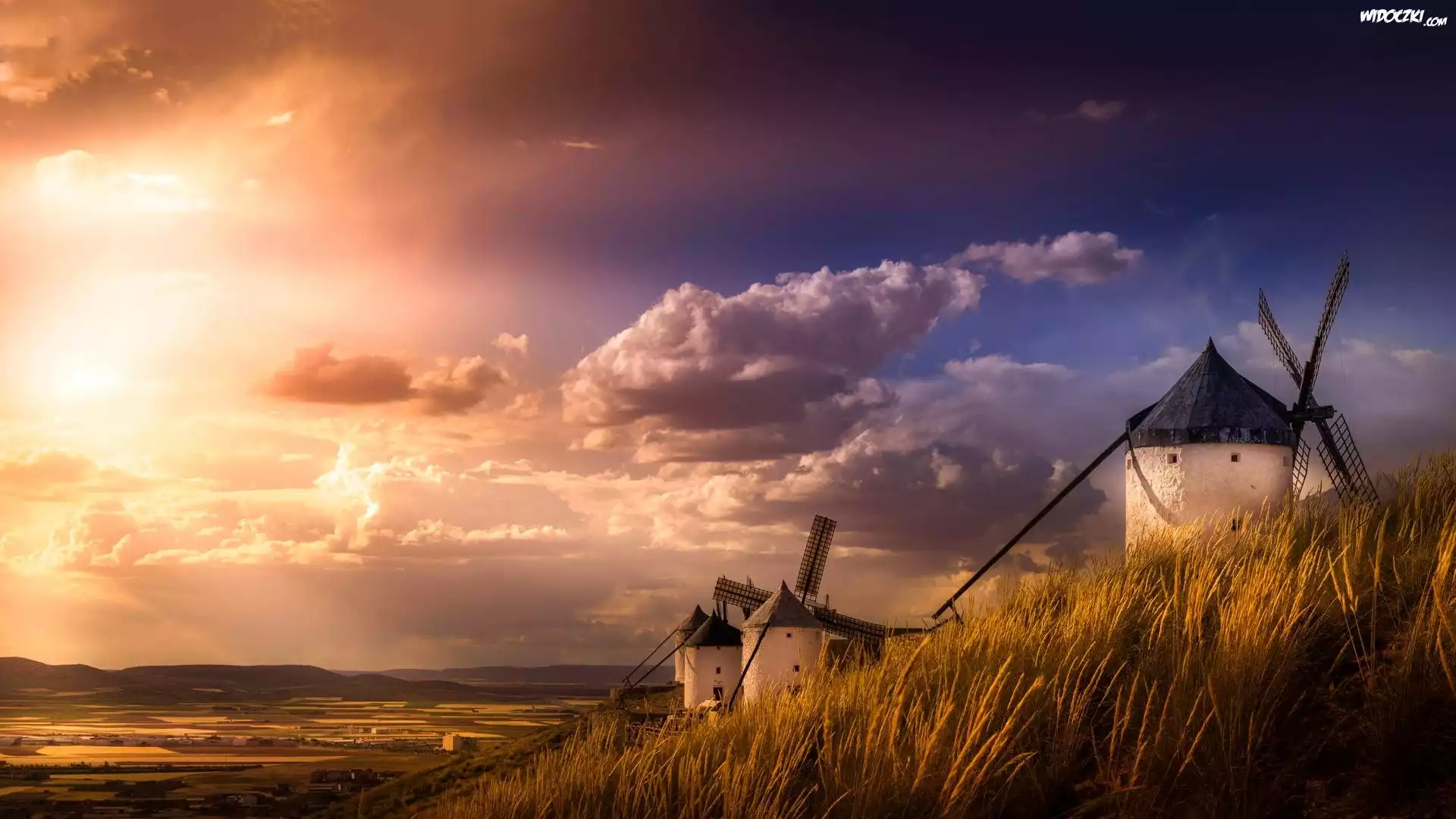 Wiatraki, Farmy, Pola, Łąki, Góry, Chmury, Grecja