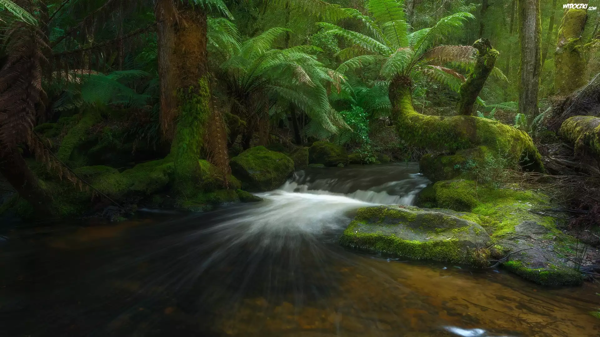 Zdjęcia, Australia, Tasmania, Park Narodowy Mount Field, Las deszczowy, Drzewa, Paprocie, Rzeka, Strumień