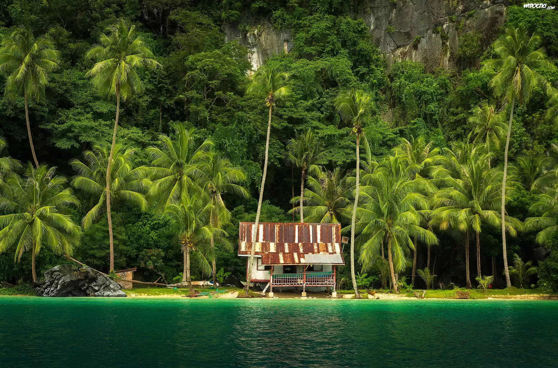 Morze, Skały, Palmy, Chata, Brzeg, El Nido, Wyspa Palawan, Filipiny