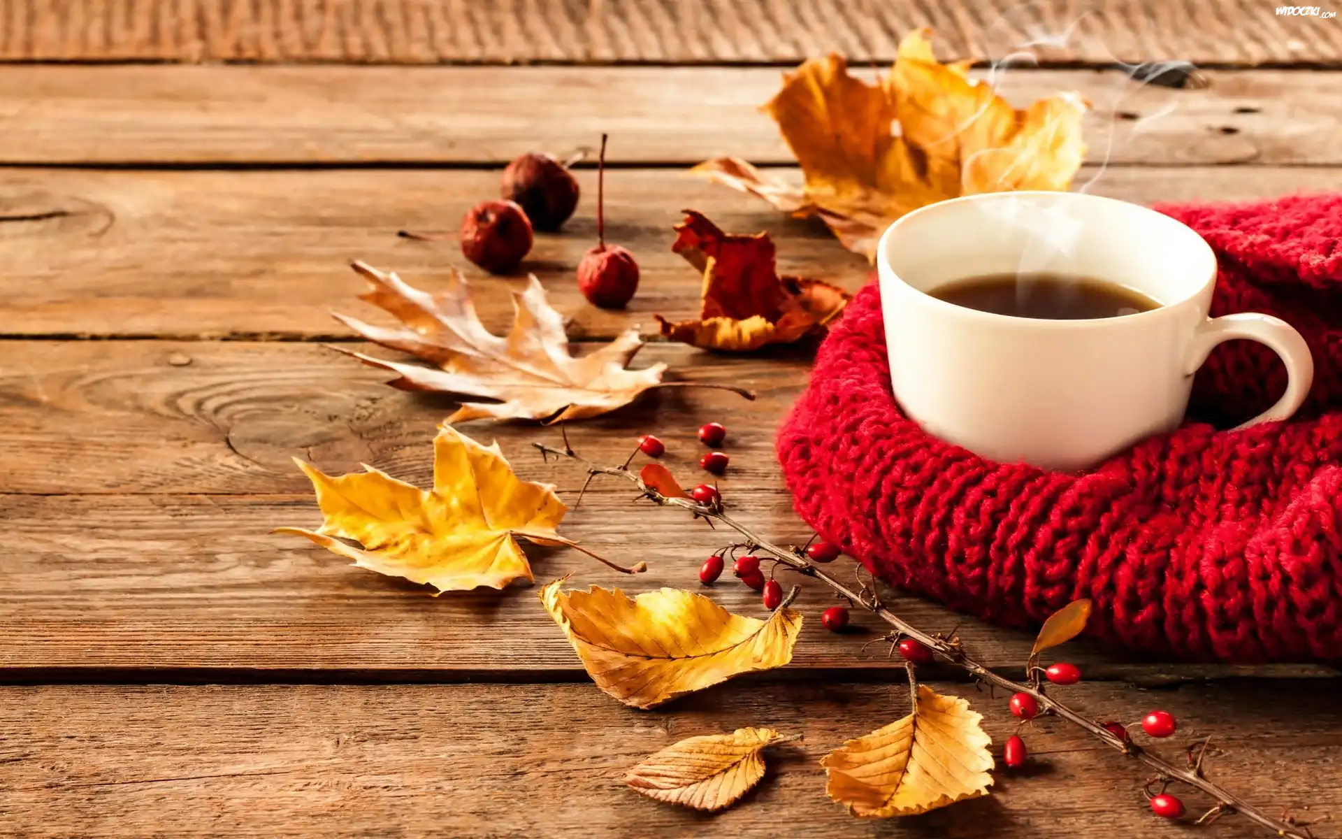 Zdjęcia, Filizanka, Kawy, Jesienne, Liście, Jarzębina, Kompozycja
