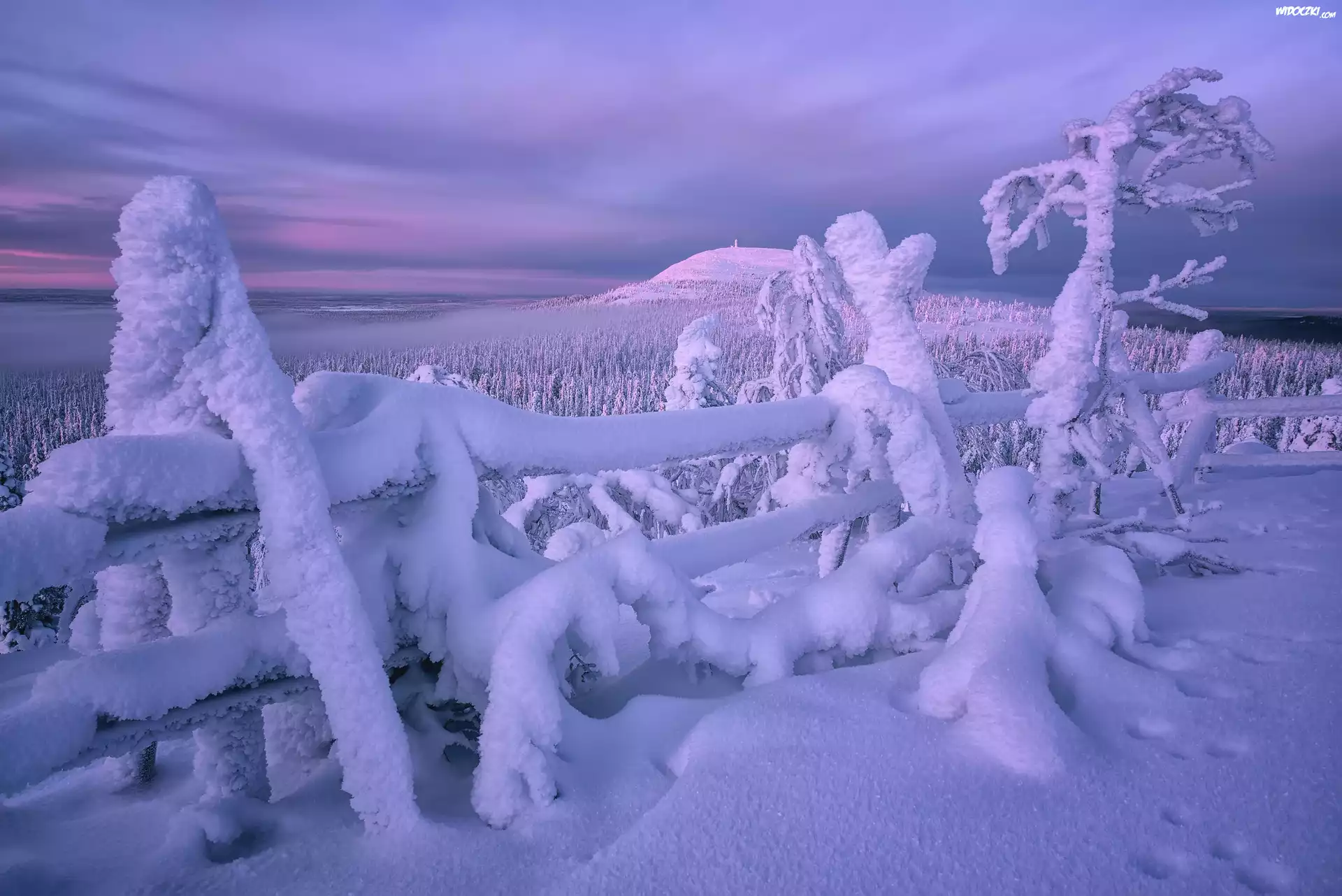 Zdjęcia, Zima, Zaśnieżone, Drzewa, Ogrodzenie, Wzgórze, Rezerwat Valtavaara, Laponia, Finlandia