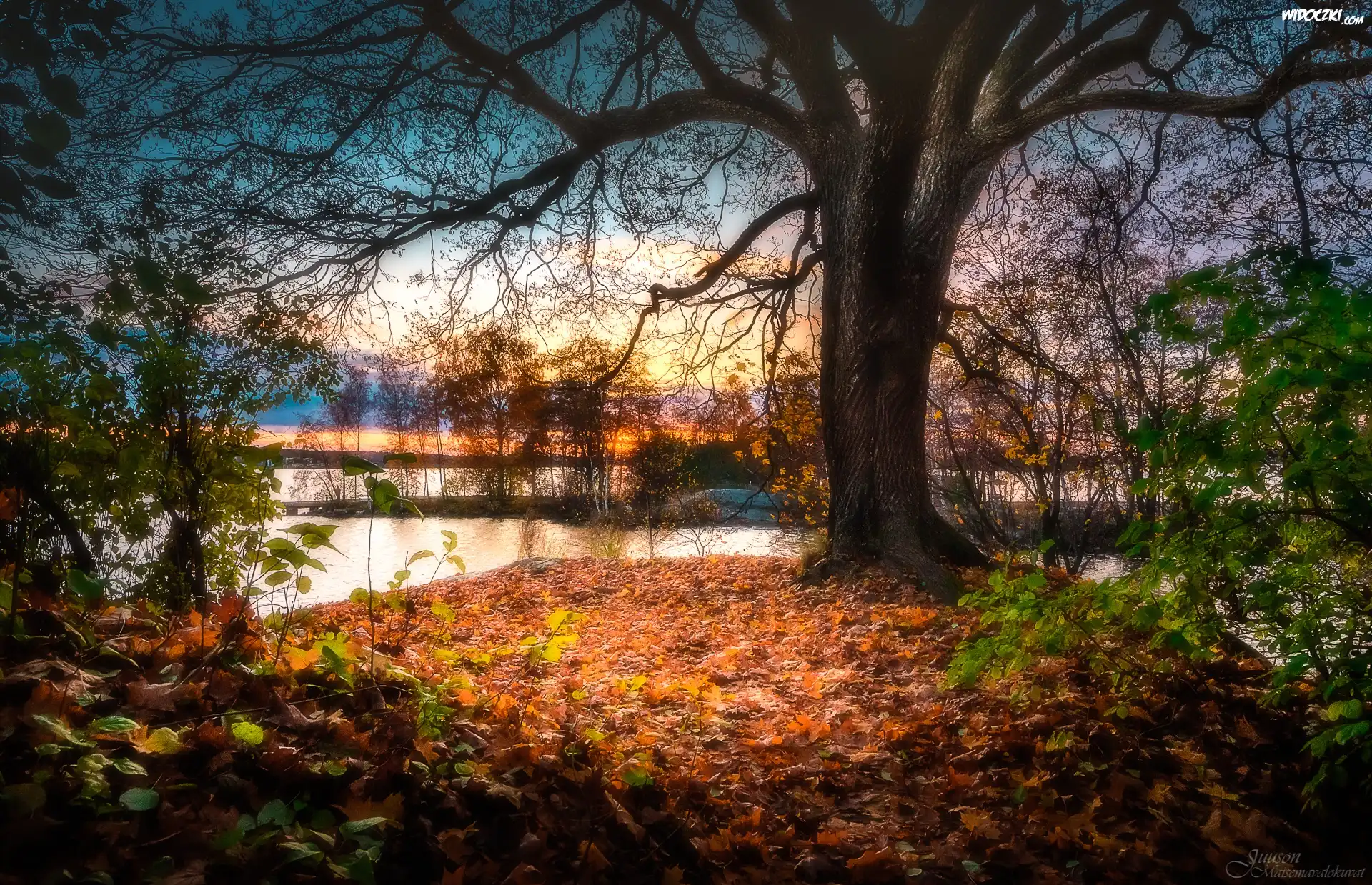 Finlandia, Miasto Tampere, Park Southern Park, Jezioro Pyhäjärvi, Jesień, Drzewa, Liście