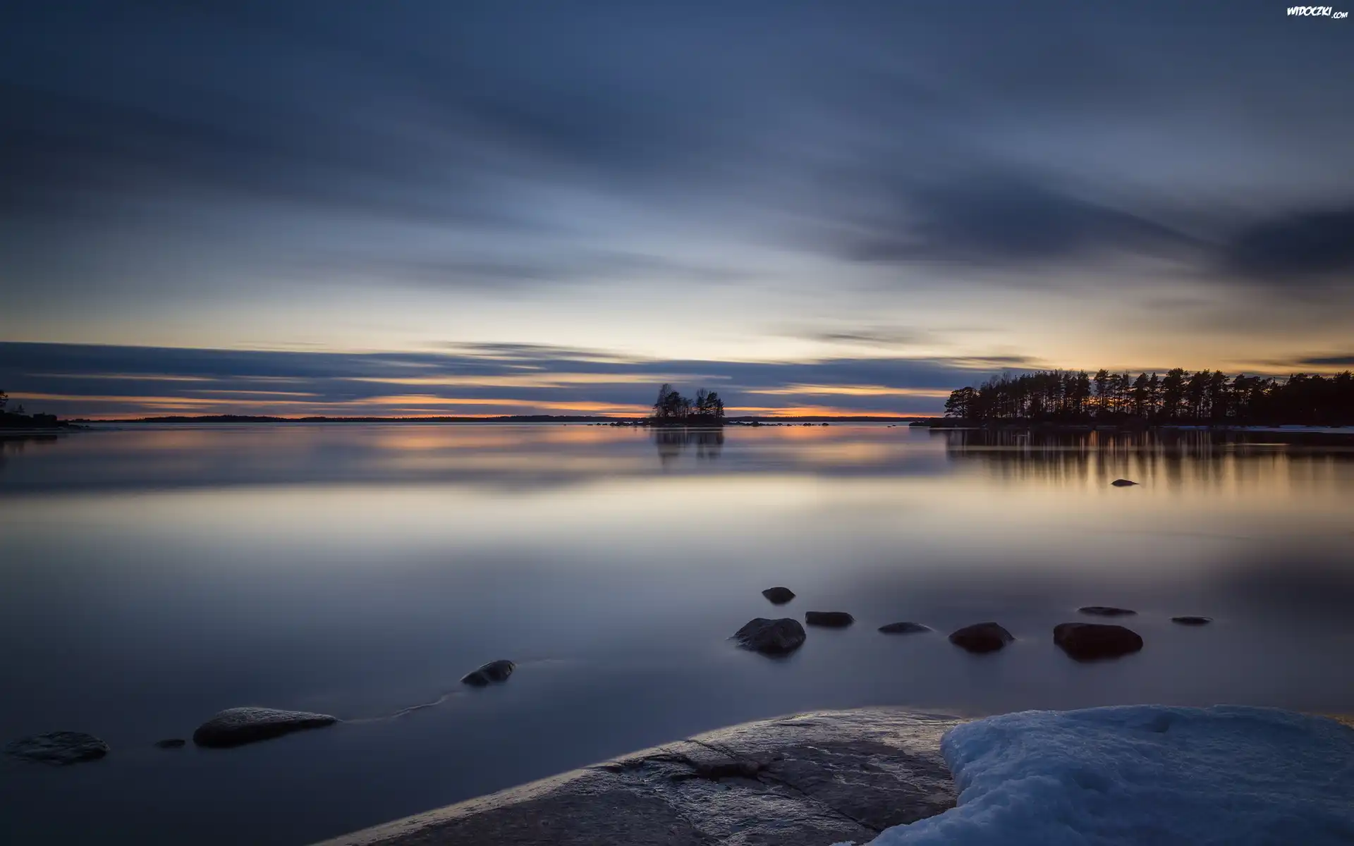 Zdjęcia, Finlandia, Kamienie, Drzewa, Zachód słońca, Morze