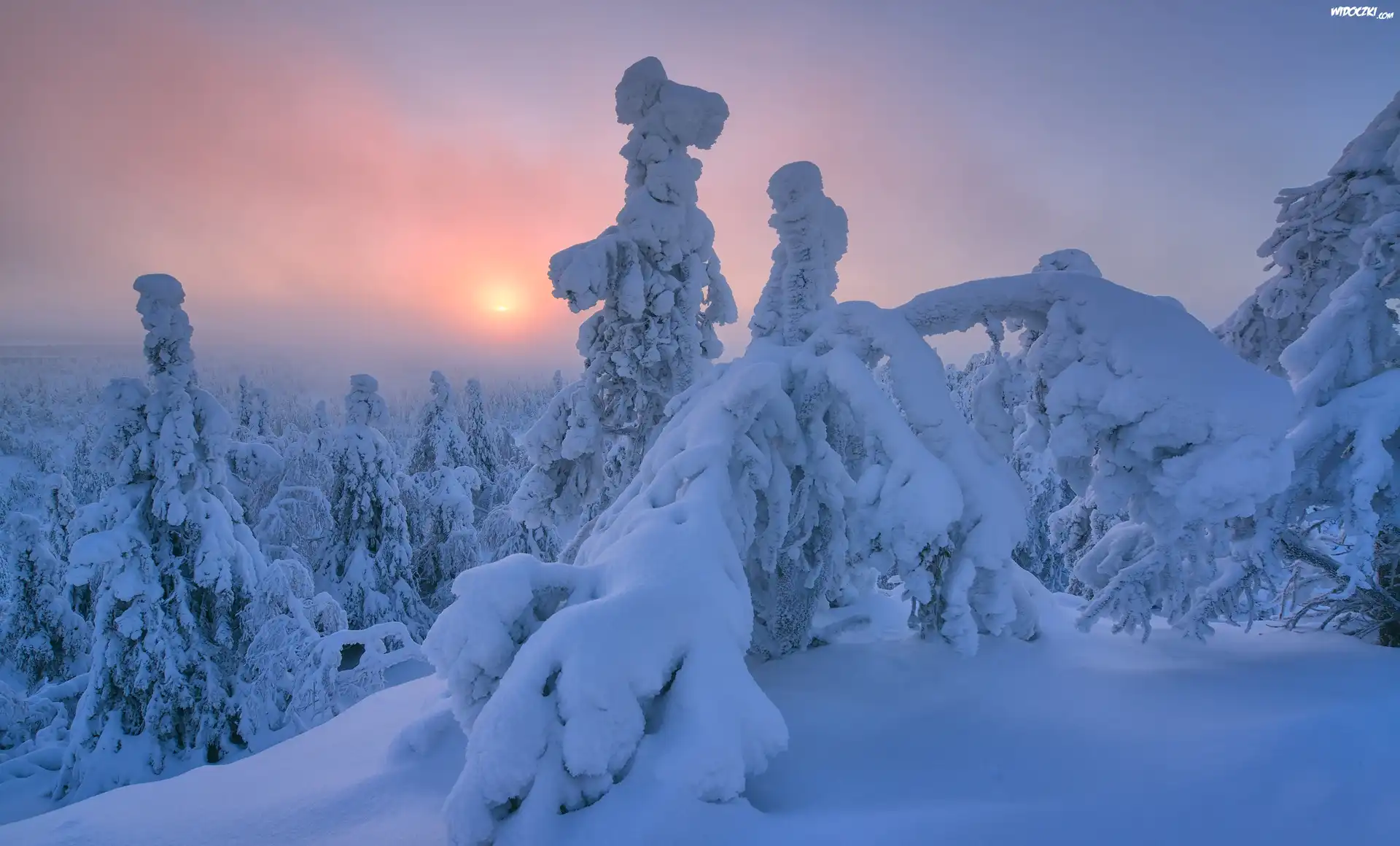 Zdjęcia, Zima, Drzewa, Mgła, Wschód słońca, Wzgórze, Rezerwat Valtavaara, Laponia, Finlandia