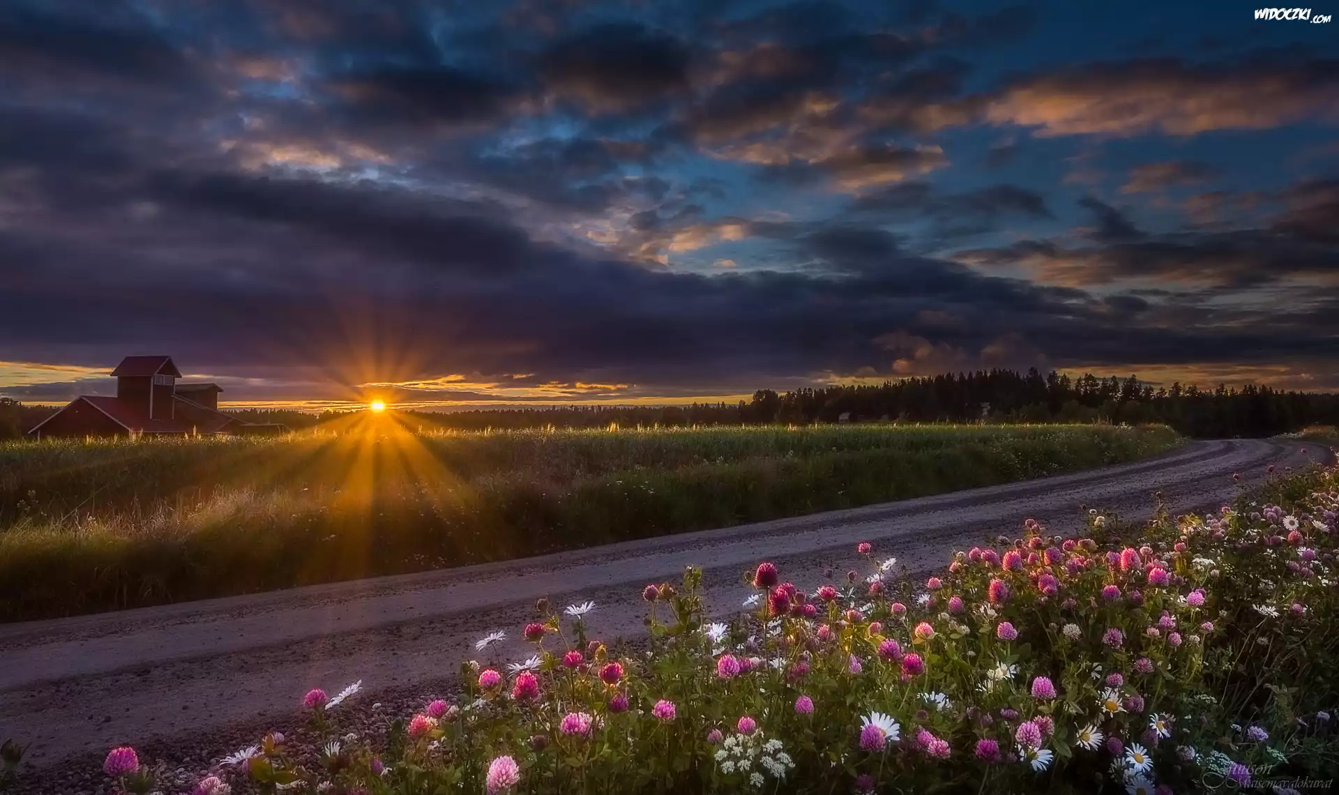 Finlandia, Gmina Tampere, Zachód słońca, Droga, Pola, Polne, Kwiaty, Drzewa, Dom, Promienie słońca |