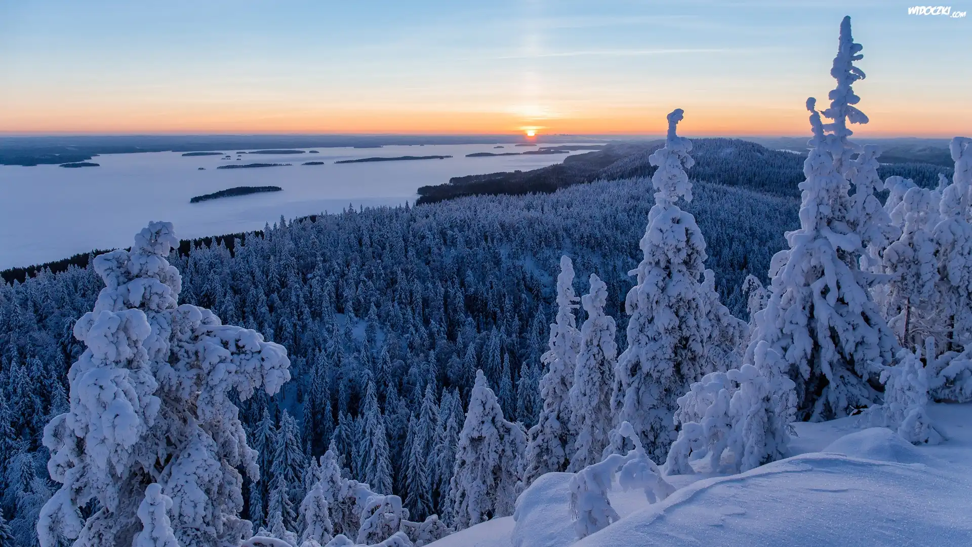 Finlandia, Karelia Północna, Park Narodowy Koli, Lieksa, Jezioro Pielinen, Zima, Las, Wzgórza, Ośnieżone, Świerki, Zachód słońca |