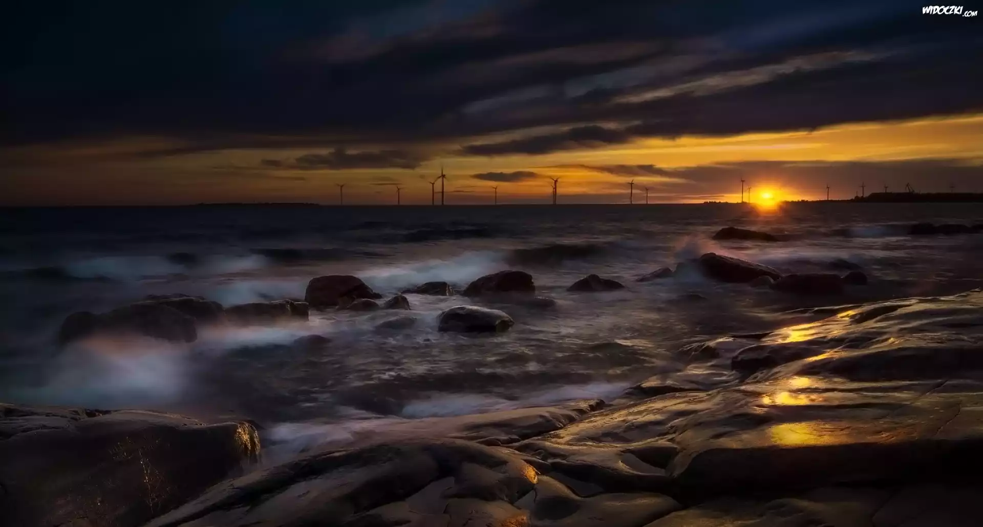 Finlandia, Morze Bałtyckie, Zatoka Botnicka, Miasto Pori, Wyspa Reposaari, Skały, Zachód słońca, Wiatraki |
