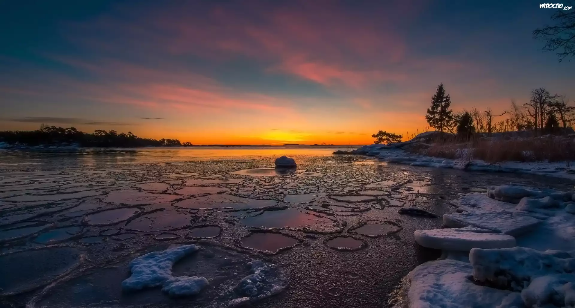 Przylądek Kallahti, Finlandia, Zima, Zatoka, Morze Bałtyckie, Lód, Drzewa, Wschód słońca
