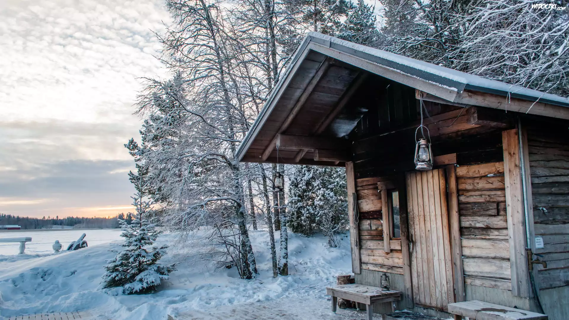 Zdjęcia, Finlandia, Lemmoncarks, Budowla, Sauna, Ośnieżone, Drzewa, Jezioro Payanne, Zima, Śnieg