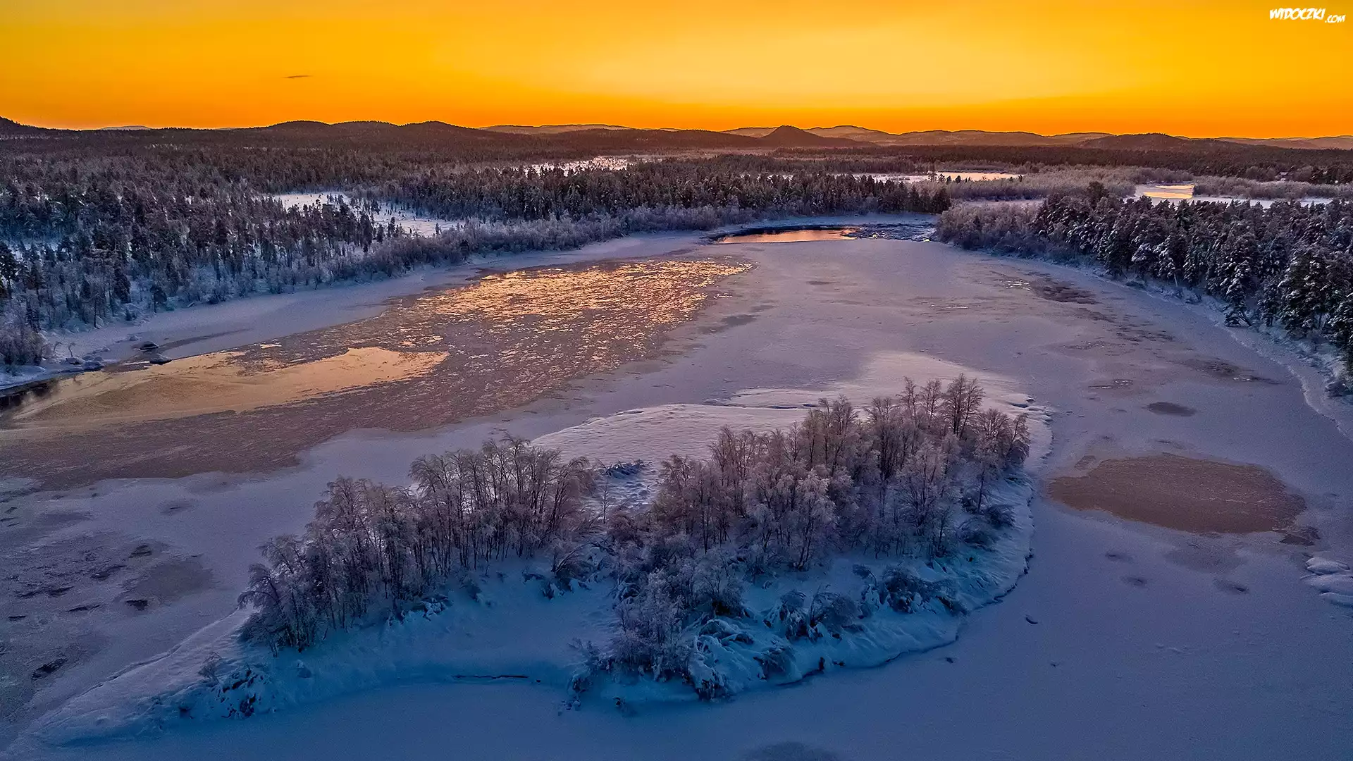 Zachód słońca, Rzeka Kettujoki, Zima, Ośnieżone, Drzewa, Lód, Laponia, Finlandia